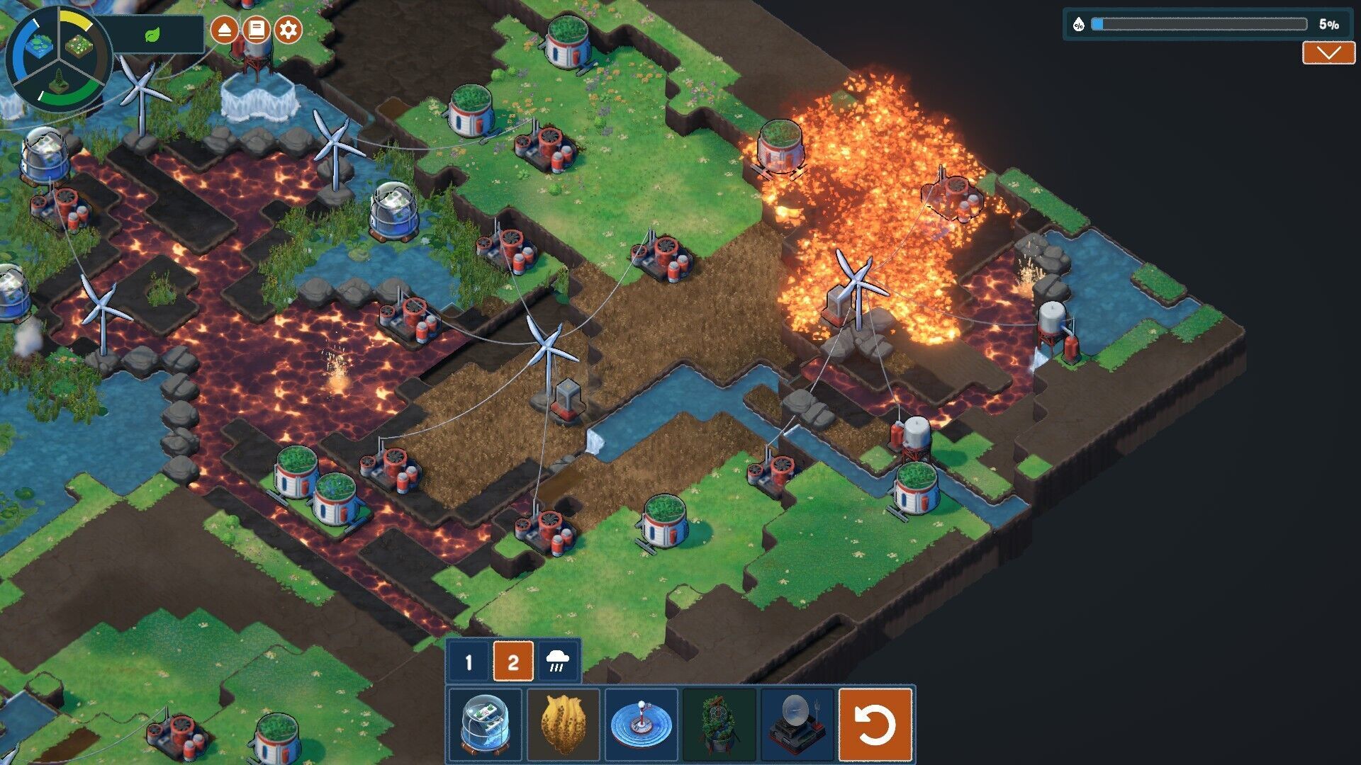 Por esa razón decimos que no se trata de un juego de gestión, porque no tenemos que hacer prosperar un lugar en el que quedarnos sino resolver un problema de contaminación y marcharnos. Además, los edificios y las tecnologías que colocamos no tienen tiempo de carga ni de investigación, son inmediatas, y los únicos valores que tenemos que tener en cuenta son la humedad, la temperatura y la contaminación del lugar, nada de felicidad, recursos ni cosas por el estilo.