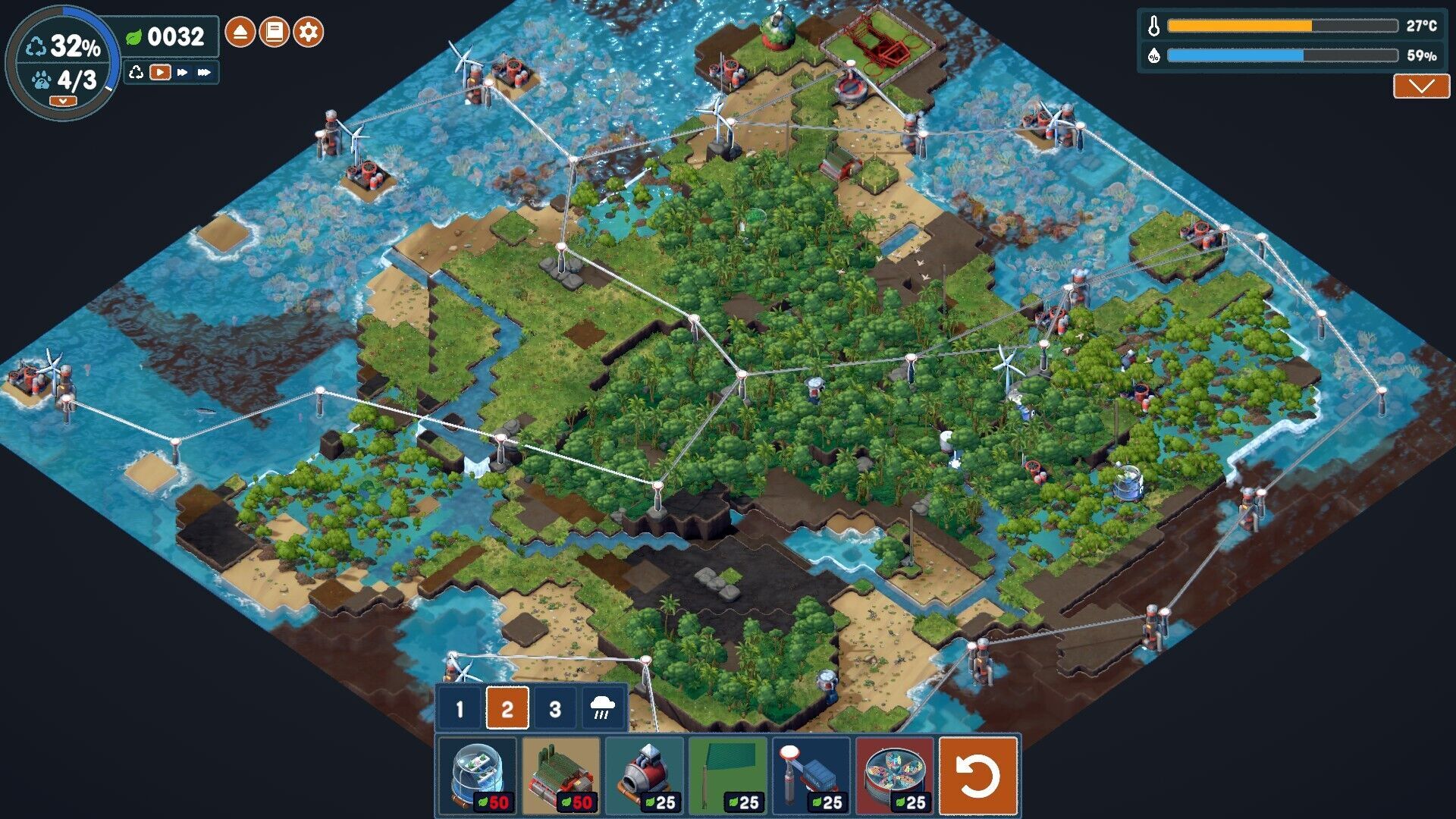 Lo segundo lo consigue de una forma quizás más sutil, pero importante dentro de cada partida: a través del sistema de puntos. Para colocar edificios tenemos que pagar los puntos que cuestan cada uno de ellos (representados con hojas verdes). Sin embargo, al contrario de otros juegos de estrategia, si un edificio tiene cierto coste pero lo colocamos de una manera que favorezca la labor de restauración del ecosistema entonces no sólo no nos costará nada, sino que nos recompensará con puntos extra. De lo contrario, si colocamos edificios sólo por afán estético, perderemos puntos.