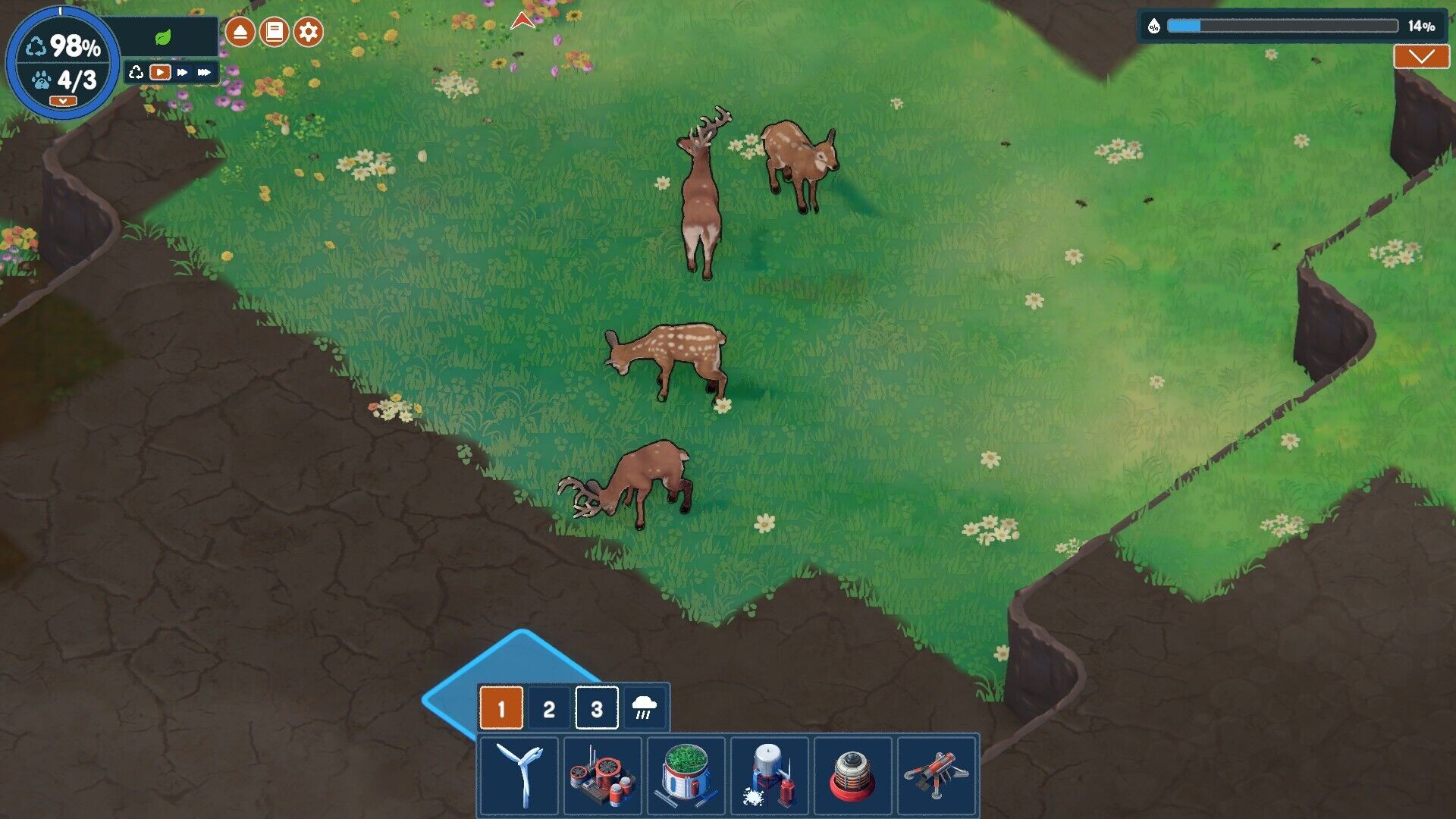 Terra Nil parece un juego de gestión, pero ni de lejos es un tycoon tradicional. Es más bien un juego de estrategia, un puzle en tres tiempos que nos desafía a recuperar entornos devastados: a base de colocar edificios en casillas tendremos que descontaminar la zona, sembrar nuevos biomas y atraer a especies animales, todo ello pagando puntos por cada máquina que colocamos, pero sin tiempo límite ni eventos aleatorios que nos obliguen a reaccionar. El tercer y último paso consiste en desandar el camino, recogiendo todo lo que hemos colocado para abandonar el lugar y dejar que los animales y plantas se ocupen de él.