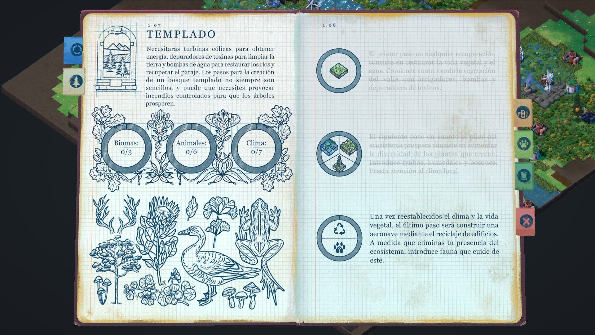 Justo en ese momento se desbloquea también otra de las mejores mecánicas de Terra Nil: la de encontrar especies animales. Con un nuevo edificio, el observatorio de animales, tenemos que ir colocando un radar en el mapa siguiendo las indicaciones que marque cada descripción. Por ejemplo, para descubrir al oso pardo no sólo tendremos que colocar el radar en un bosque, sino en uno que tenga colmenas. Así se va construyendo una nueva relación con el espacio al que nosotros mismos hemos ido dando forma, entendiendo las conexiones entre los ecosistemas y descubriendo, aunque sea a un nivel muy básico, cómo funcionan y por qué son tan importantes las cadenas tróficas en la vida real.