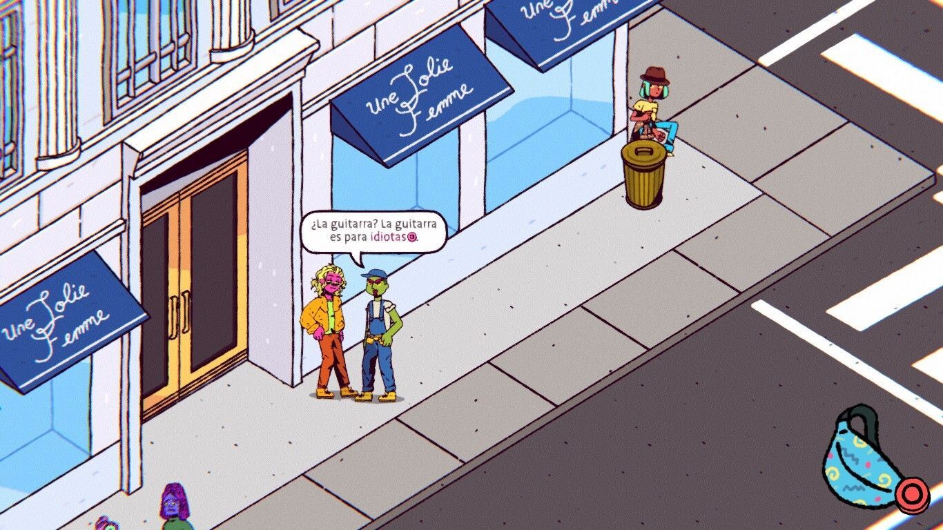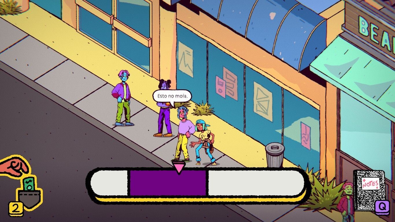 Y es que The Big Con es un juego sencillo. Caminamos, recogemos objetos, hablamos con personajes y utilizamos su mecánica de robo (dejar pulsado un botón y soltar cuando el cursor esté encima de una barra que se va acortando) para sustraer todo tipo de elementos del escenario. No necesita más, en realidad; con esa simpleza interactiva ya basta para que explorar el mundo exagerado que nos plantea sea mucho más divertido de lo que es en otros juegos. La clave está en el guión, en su buena escritura y en lo frescas que son todas las conversaciones con los peculiares NPC que nos encontramos por el camino.