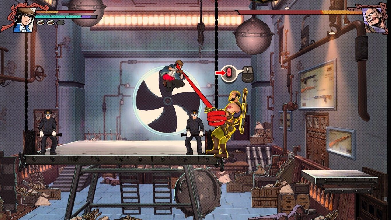 Además del combate, otro pilar fundamental de The Legend of Tianding es el movimiento. Nuestro protagonista es un hábil ladronzuelo capaz de trepar edificios, colarse por rendijas o saltar entre muros. Es cierto que estas mecánicas tienen su utilidad durante las peleas, pero también juegan un papel fundamental en la exploración tanto de los escenarios independientes (cloacas, fábricas, montañas y demás pantallas que preceden a los jefes finales), como de la propia ciudad, donde podemos encontrar vecinos con los que hablar, personas sintecho a los que ofrecer limosna a cambio de mejoras, mesas para jugar a las cartas y encargos que funcionan como objetivos secundarios.