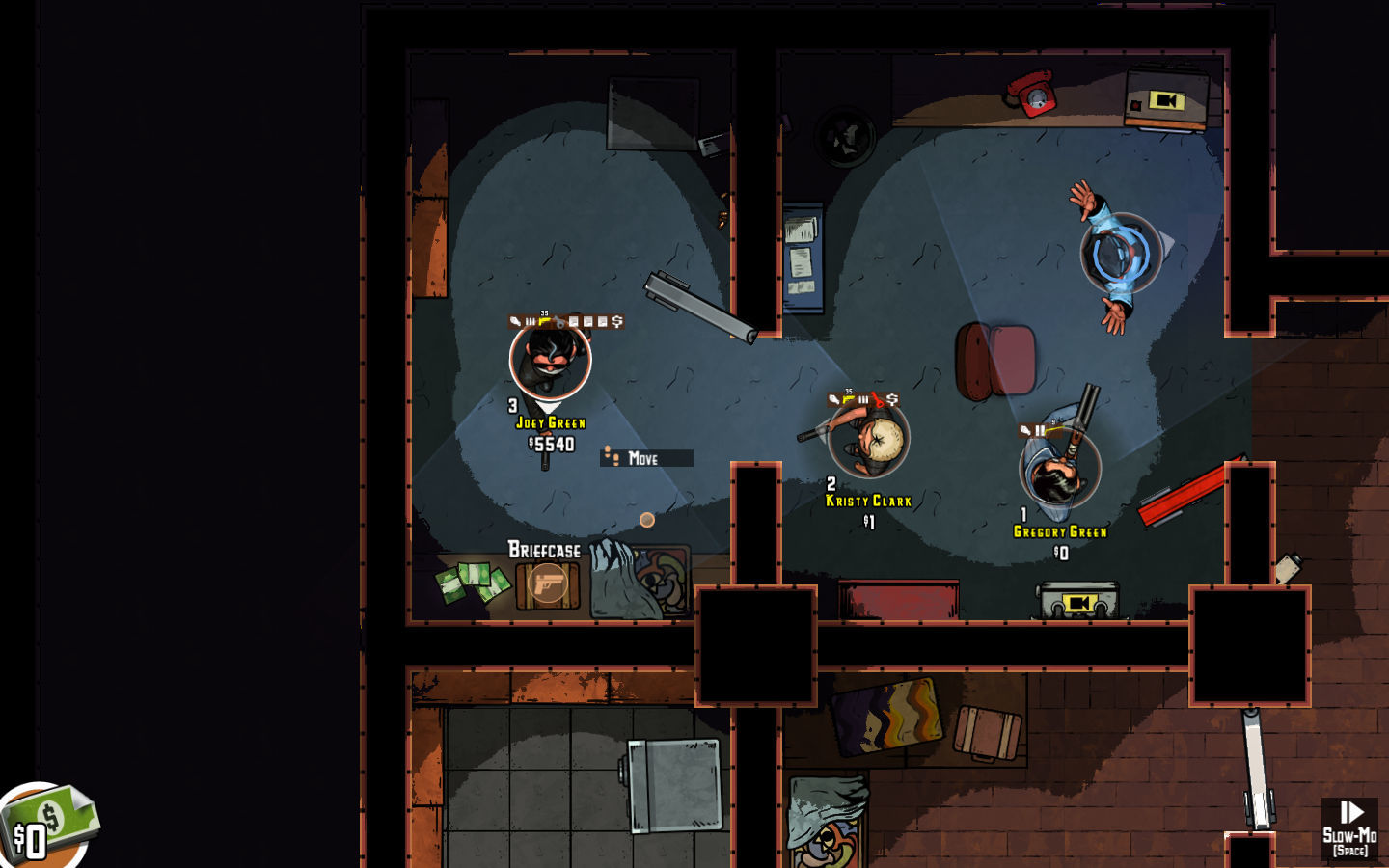 A diferencia del citado Hotline Miami, no se trata de tirotear todo lo que se cruza en nuestro camino dejando un reguero de sangre y destrucción. Sacar una pistola –incluso descargada- es suficiente para que los rehenes que tienen la mala fortuna de están presentes en el atraco levanten sus manos e incluso pasen a ser controlables –es decir, simula que reciben nuestras órdenes-. Y el control es muy similar al de una aventura gráfica de apuntar y clickear, en general de ritmo pausado, aunque es cierto que algunas acciones son temporales y hay que tener claras las prioridades si surge un imprevisto.