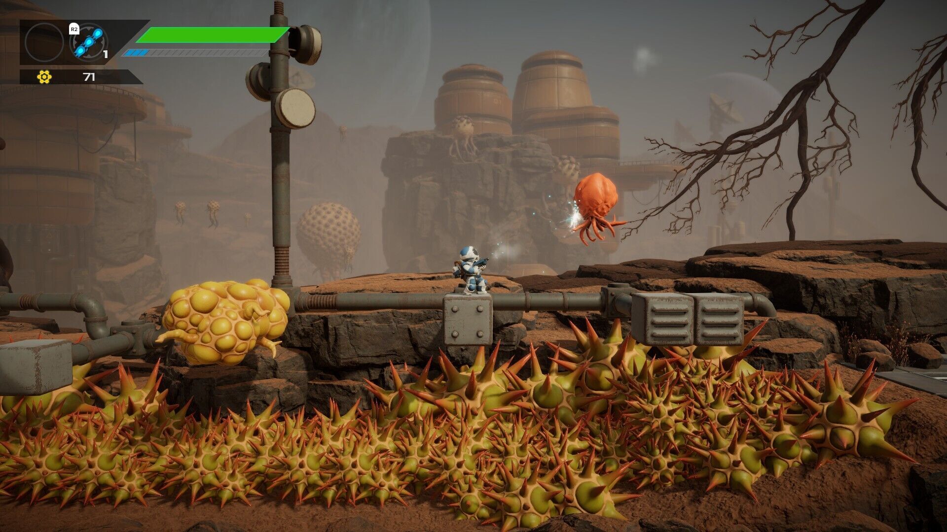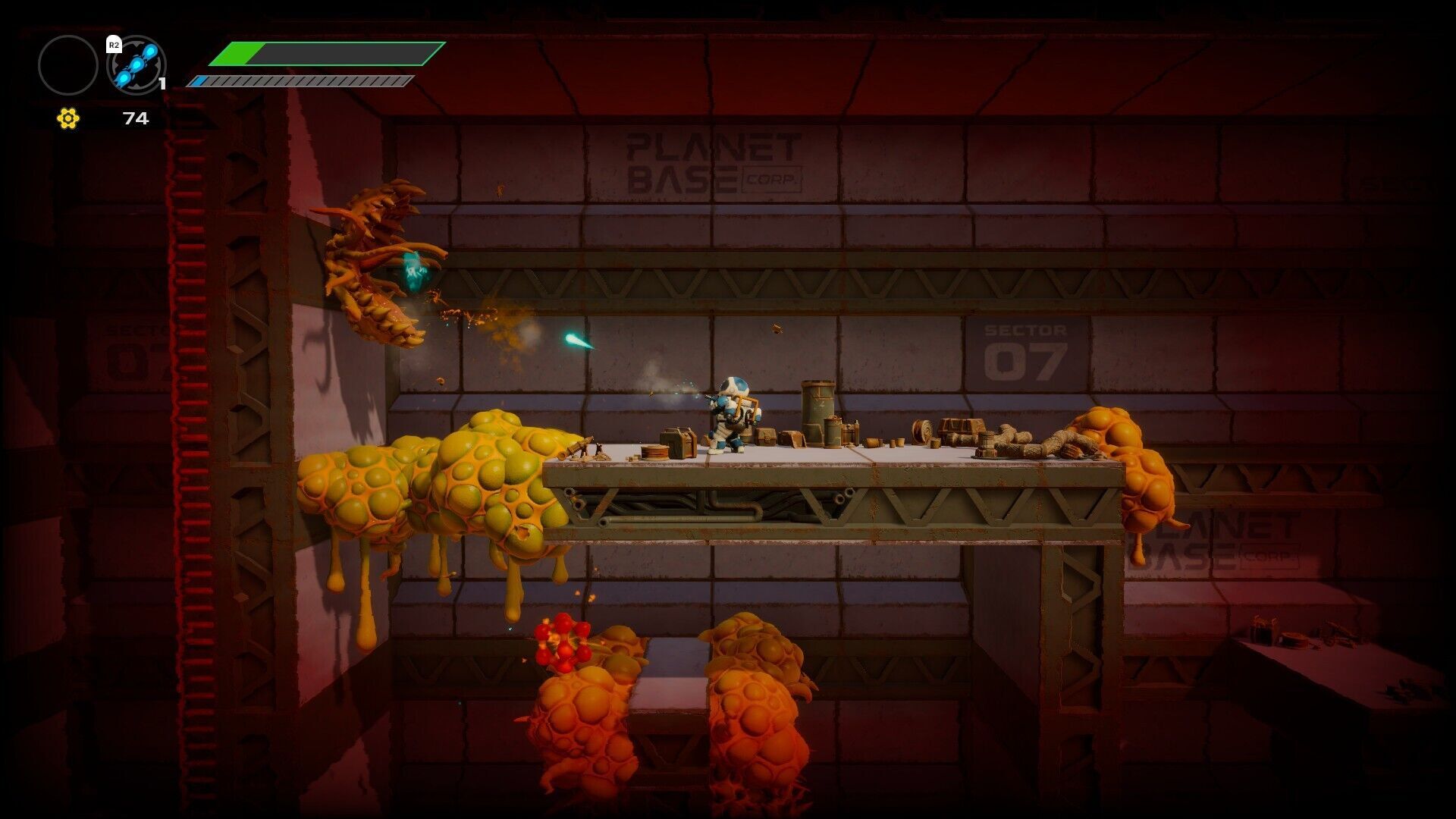 Así pues, lo que tenemos es un juego de acción en unos mapas un poco laberínticos –no tanto como otros metroidvania- que combinan criaturas enemigas con plataformas, y muchas de ellas son formas de vida globulares; este elemento viene en diferentes colores, así que ciertas plataformas son sólidas, mientras que otras son susceptibles de ser destruidas con los disparos, desaparecen a los pocos segundos de subir encima o son dañinas. Como imaginarás, esto da juego a diferentes desafíos con saltos, con alguna criatura alienígena flotante o con proyectiles incordiando, y cierta sensación de desorientación porque muchas veces hay diferentes rutas alternativas.