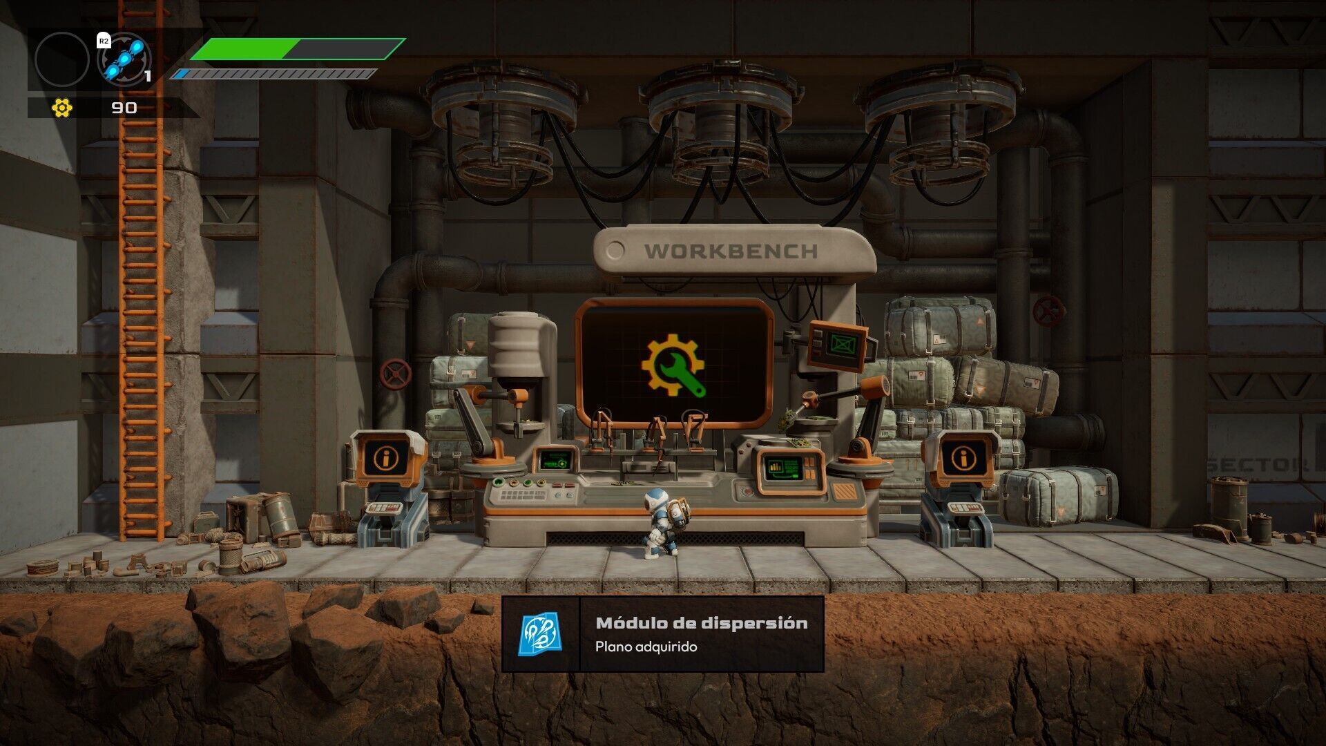 Nuestra arma inicial es, por suerte, de munición infinita, pero los disparos no tienen mucha trayectoria. Necesitarás acercarte a los enemigos o los diversos aparatos que sirven para resolver pequeños puzles, como generadores eléctricos que activan rayos; hay un puñado más para manejar que varían en cadencia, alcance, trayectoria o dispersión. El disparo abarca 360º al estilo twin-stick shooter, de manera que podrás disparar a tus objetivos con precisión, pero con el tiempo conseguirás mejor equipamiento para cada reto previa colección de unos engranajes a lo largo del mapa –o que dejan caer los enemigos- y planos de nuevas armas. Es la típica capa rolera de casi todo metroidvania para dar un incentivo extra a la exploración, que poco a poco se irá expandiendo con el acceso a nuevos lugares gracias a herramientas de escalada o incluso un paracaídas que nos facilita planear.