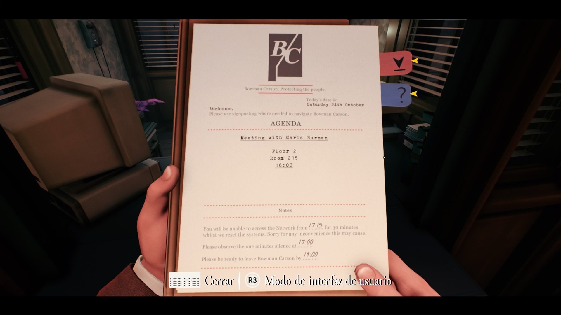 Ese fantasma sobre nuestro hombros, el del tiempo que avanza de forma inexorable y que nos aleja y acerca -al mismo tiempo- de la verdad que ansiamos descubrir es uno de los mayores aciertos del videojuego. Destapar la conspiración o a los autores materiales de los hechos es nuestro mayor objetivo, y para ello debemos escudriñar hasta el último píxel del escenario. Da igual que se traten de ordenadores protegidos con contraseñas, cajas fuertes ocultas y recónditas o disquetes encriptados. Aquello que ansiamos y deseamos puede estar ahí, a la vista de todos o guardado en un cajón. ¿Cómo empezamos? ¿Hacia dónde tenemos que ir? ¿Qué hay que hacer? Pese a que The Occupation tiene una introducción que nos ayuda a comprender las dinámicas del juego, los primeros minutos tras el prólogo pueden ser abrumadores. La libertad de exploración es muy grande, y no sabremos qué hacer en concreto hasta que arranquemos a abrir puertas, subir escaleras o conversar con algunos de los personajes que tenemos rondando por el edificio.