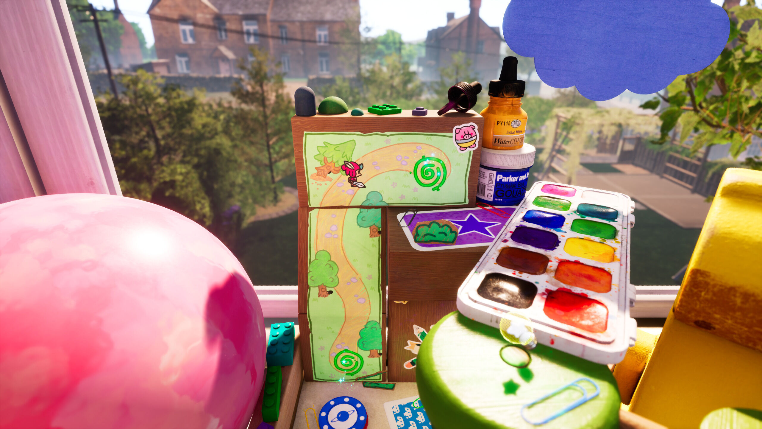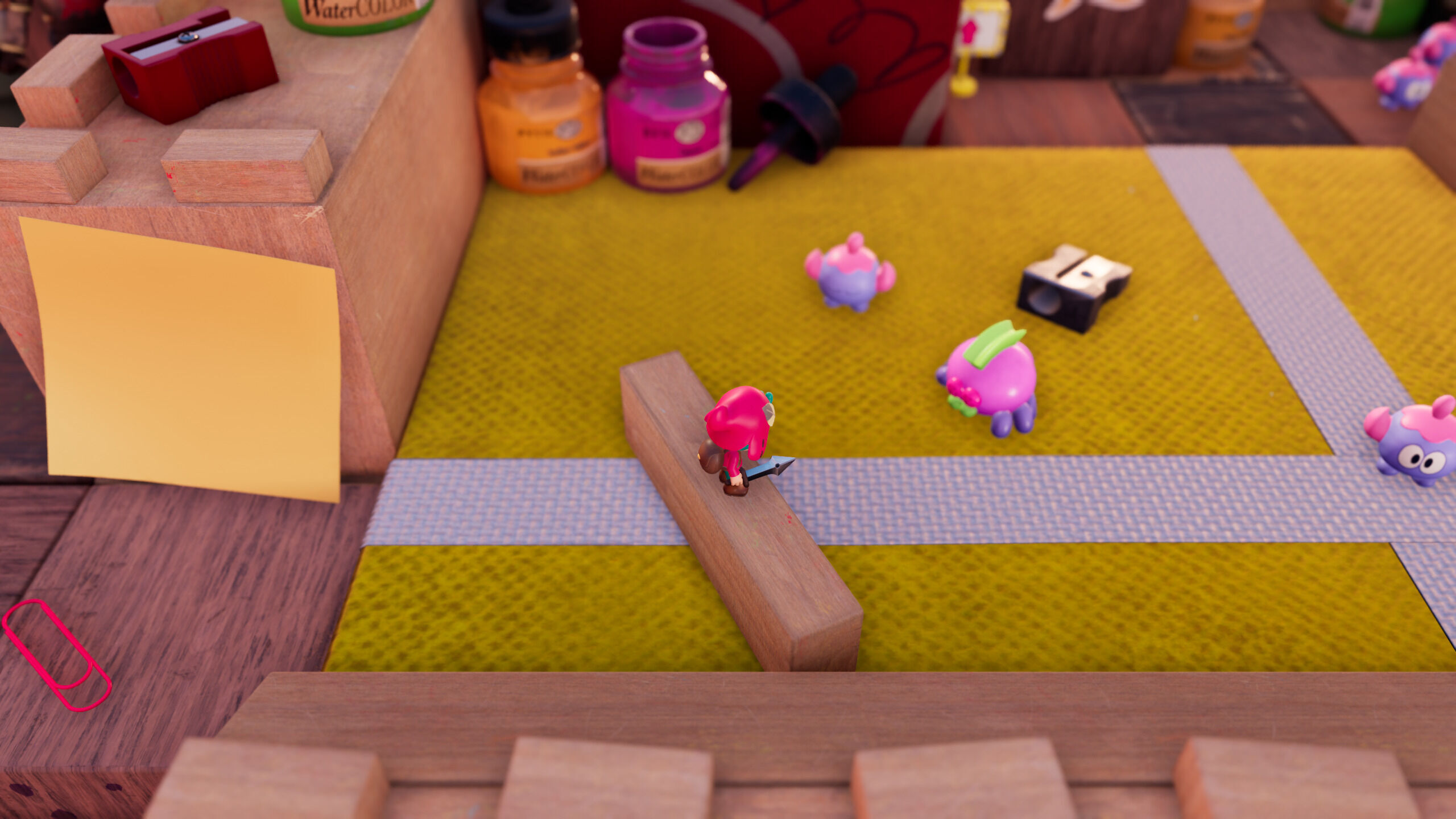 Para conseguir los poderes que nos permiten alterar el cuento será necesario explorar el escritorio donde Barbaluna ha escondido los artefactos que nos otorgan esas capacidades. Cuando toca hacerlo, ante nosotros se dispone un nivel de un plataformas 3D (sin cámara libre, por cierto, un acierto para que los chavales puedan disfrutarlo sin problemas) formado por cajas de cartón, reglas, muñecos y otros juguetes y utensilios habituales en la habitación de un niño. Los saltos son muy sencillos y el combate contra las criaturas de Gruñonzón extrapola a las tres dimensiones las básicas mecánicas de los enfrentamientos bidimensionales. La chispa no está en la profundidad, sino en la variedad. Una lluvia de ideas constante: meternos en los dibujos de tazas ilustradas para recuperar partes de un cohete, colarnos en los garabatos que recorren las paredes para salvar distancias imposibles, y hasta huir de dinosaurios con muy mala baba.
