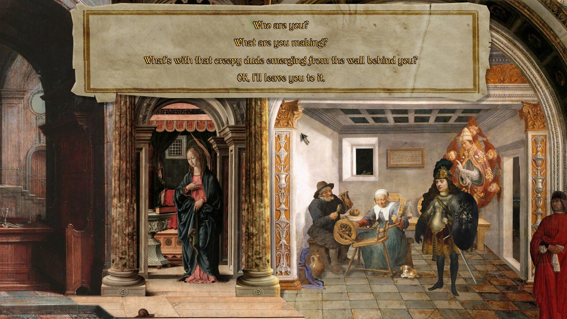 Quizás no muchos recuerden Four Last Things, una aventura gráfica inspirada en los cuadros renacentistas y el humor de los Monty Python creada por Joe Richardson. Se lanzó en 2017 y cosechó buenas críticas, aunque pecaba de ser excesivamente corta y que, salvo su puesta en escena, tampoco aportaba demasiado nuevo a un género pulido al máximo durante los 90. Richardson nos presenta ahora una especie de secuela –aunque se puede disfrutar perfectamente sin jugar al original- con The Procession to Calvary, que vuelve a apostar por los mismos puntos fuertes de su predecesor. Prepara tu ingenio, envaina tu espada –o no- y lánzate a la caza de Havenly Peter.