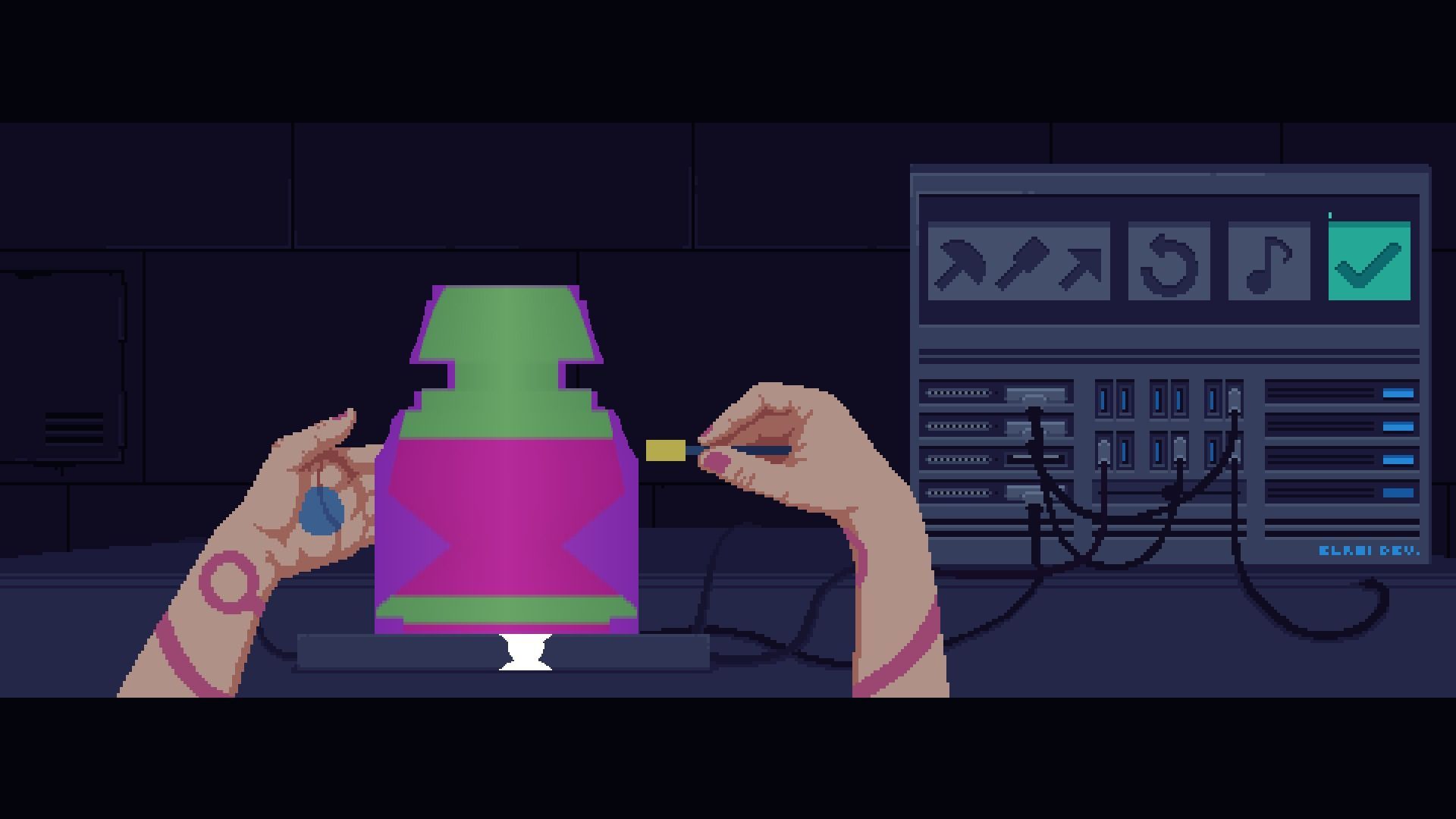 Aunque no son los únicos, hay tres tipos destacados de mecánicas en el juego, el equipo explica que proceden de ideas desarrolladas en otras tantas gamejam sobre alfarería de mejoras cibernéticas, coctelería con influencias y suplantar a gente en el teléfono. Esta última tiene un desarrollo brillante y como puzle es mucho mejor que las otras dos.