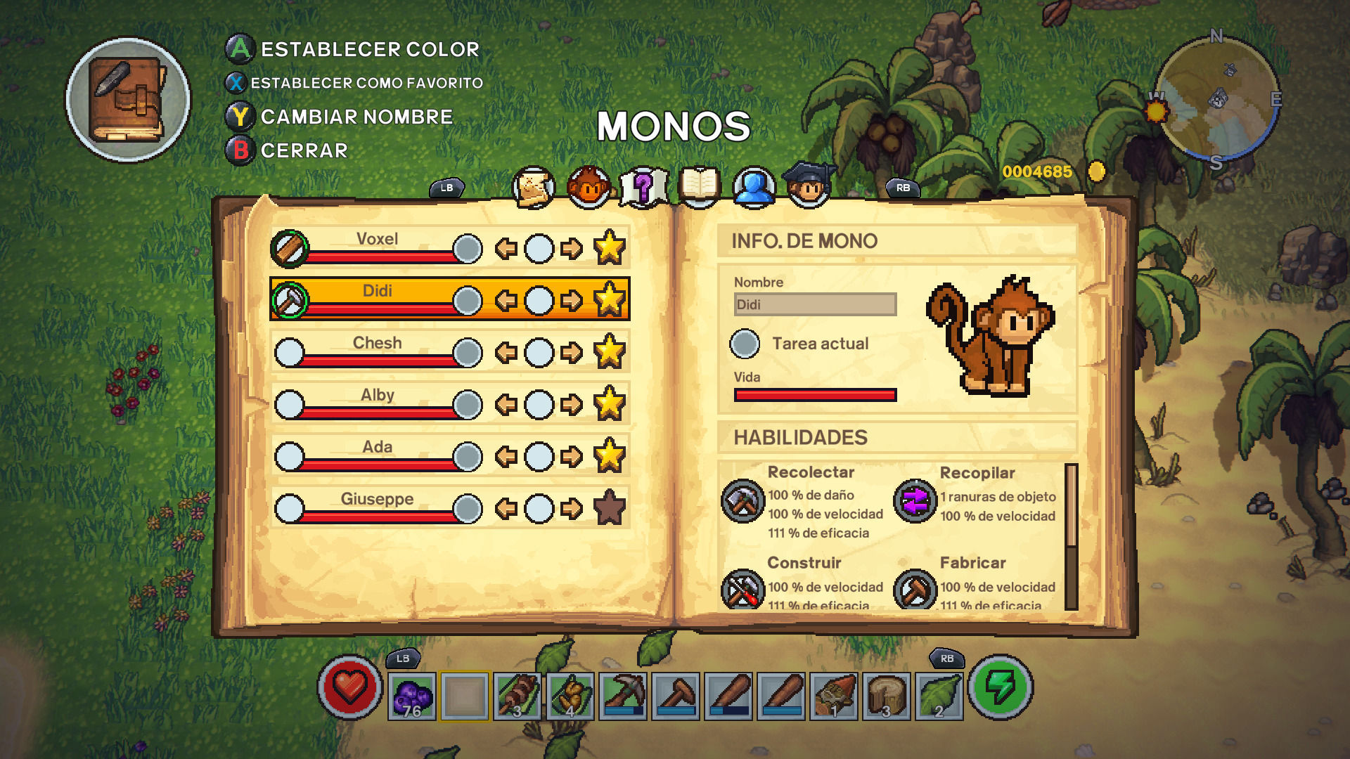Podemos ir reuniendo monos hasta formar un ejército. Incluso podemos personalizar el color de su pelaje y su nombre, al igual que se pueden modificar las características estéticas del personaje principal, y cada uno tendrá una serie de habilidades y niveles que se irán mejorando a medida que avancemos junto a ellos: recolección, caza, tala de árboles, minería e incluso combate.