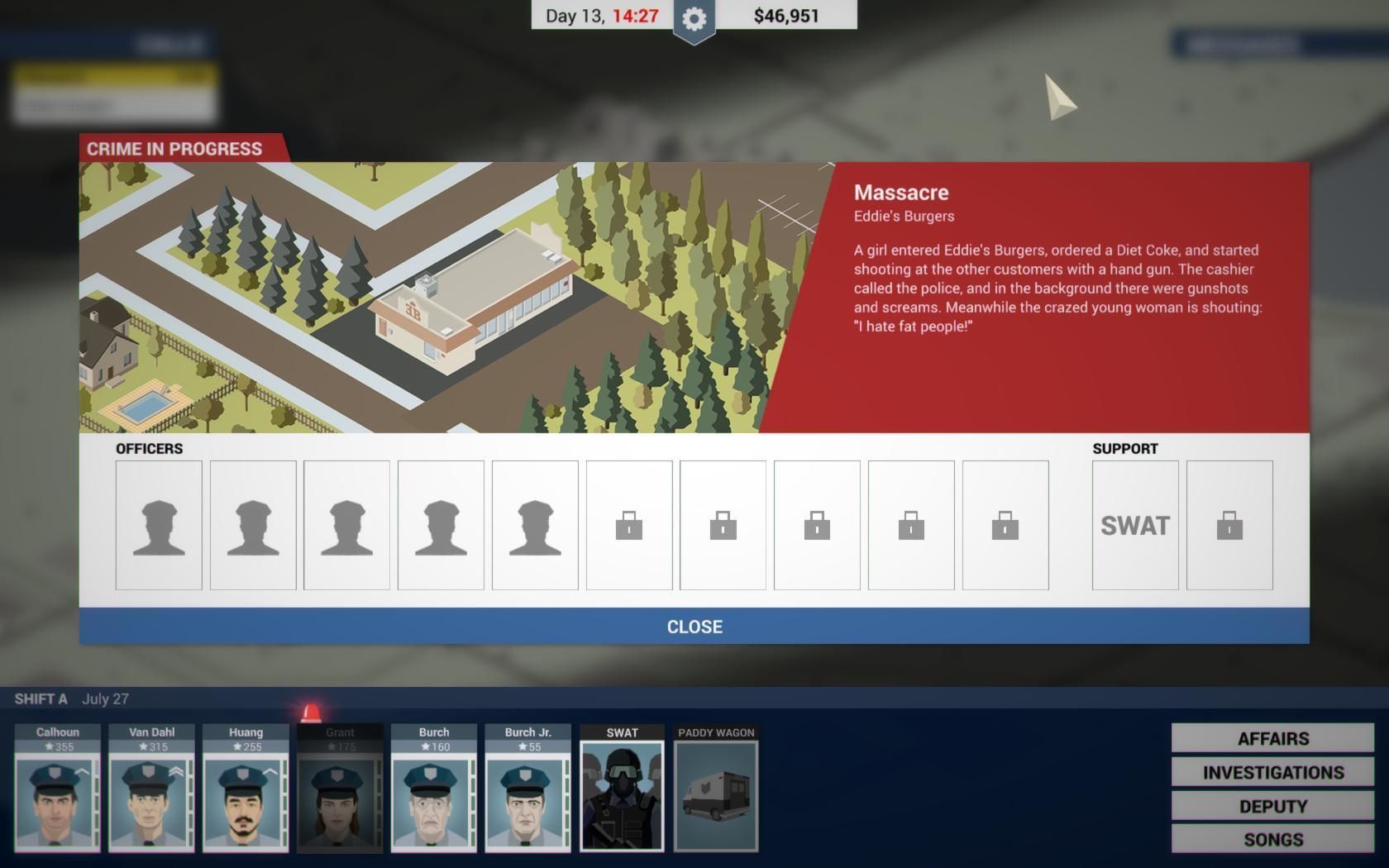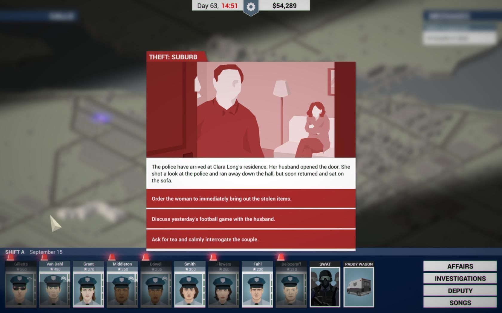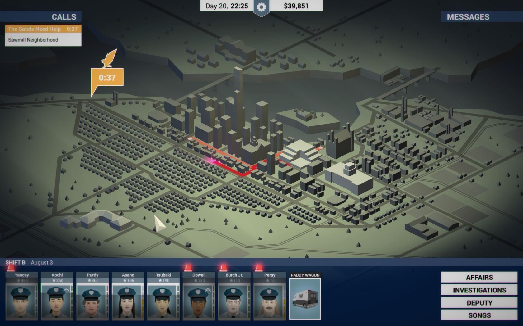 La base del juego es bastante sencilla: tienes dos turnos de trabajo, compuestos por policías -a los que asignas las emergencias que vas recibiendo- y detectives -encargados de las investigaciones-. Cada día trabaja uno de los dos turnos y, cuando recibes un aviso, envías las unidades que sean necesarias.