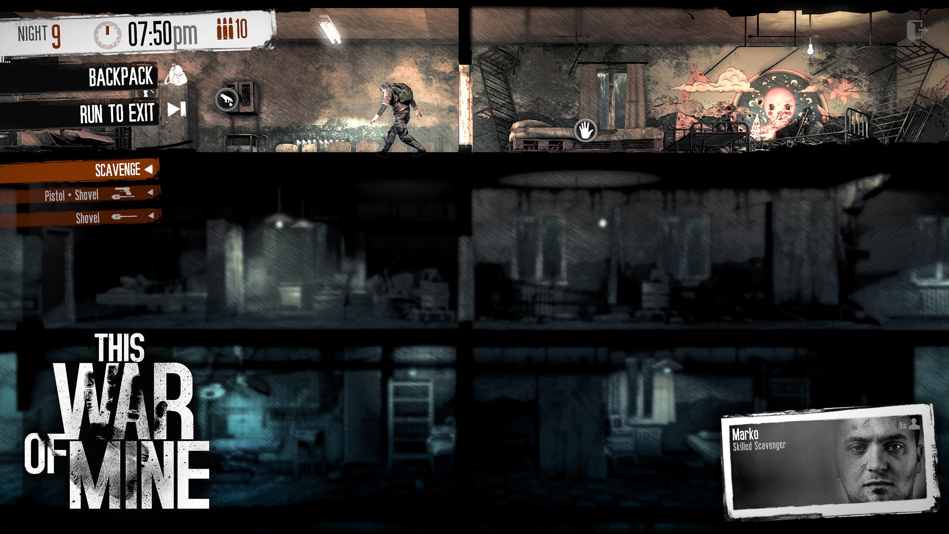 El juego genera tres supervivientes diferentes para cada partida, con lo que cada experiencia puede ser diferente en función de las facetas que muestre cada protagonista. This War of Mine nos recordará, jugablemente y estéticamente, al famoso juego de Tequila Works, Deadlight. De hecho comparte muchos puntos en común, desde su perspectiva a su control, si bien las formas, las motivaciones y el tempo de uno y otro, son radicalmente opuestas.