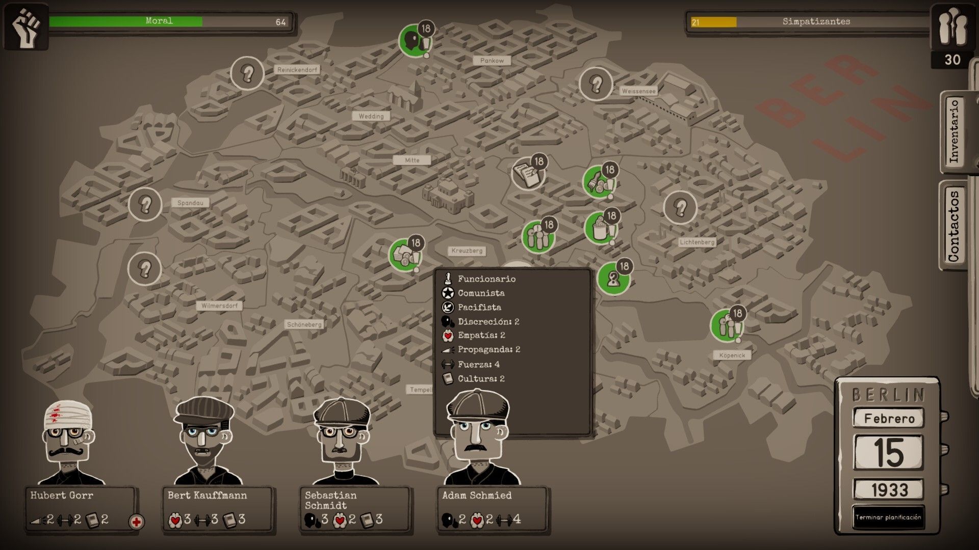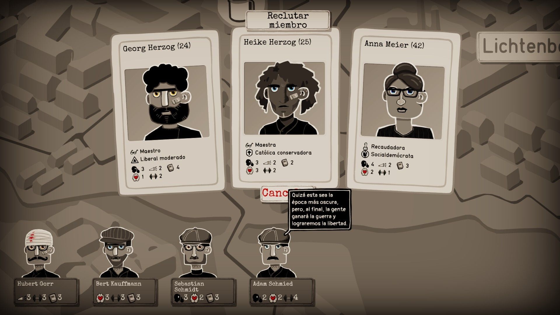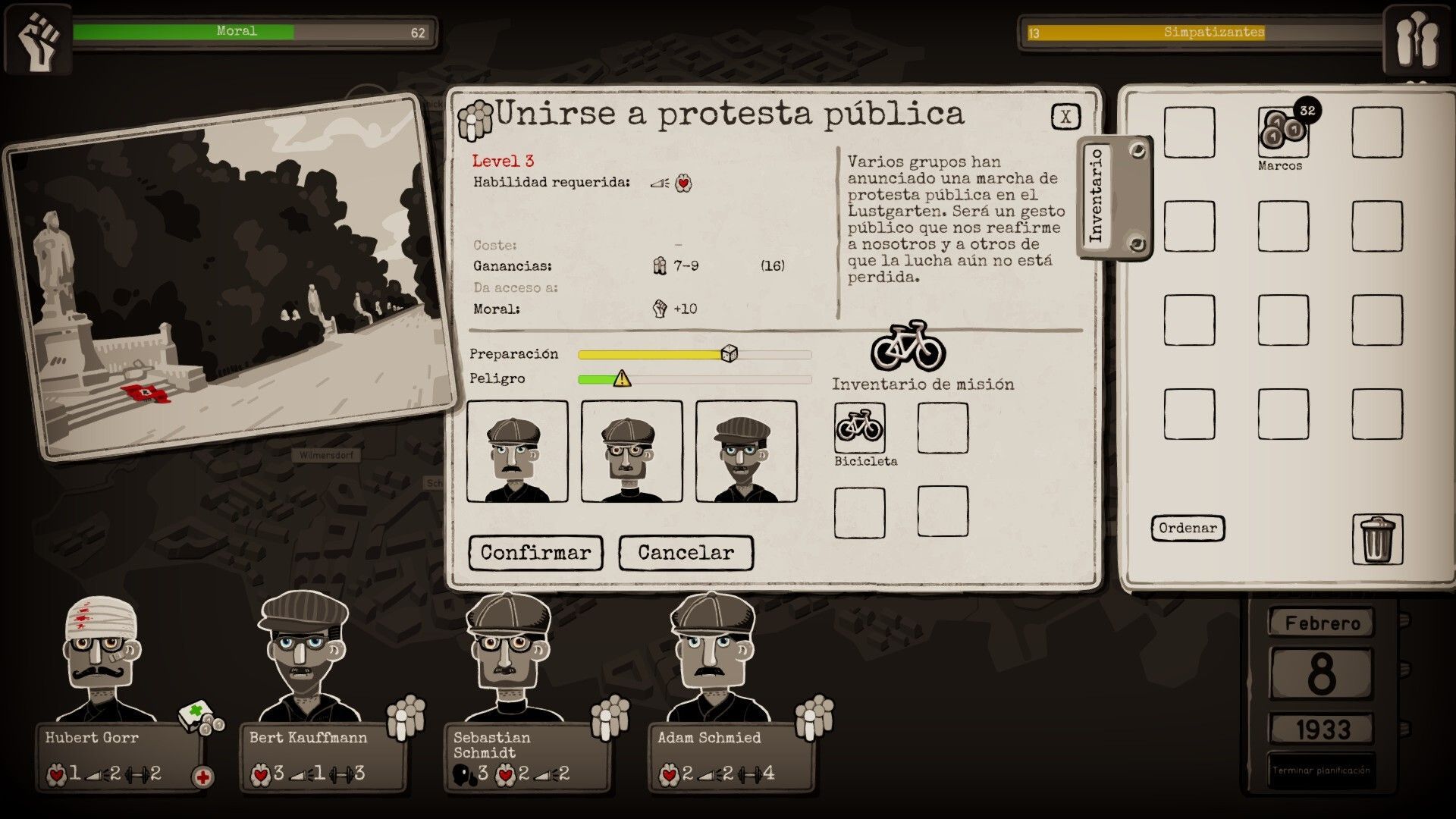 La gestión –más que la estrategia- viene por enviar uno o más personajes a la misión; cada ciudadano dispone de unos valores determinados en empatía, discreción, poder de propaganda, cultura o fuerza, que los hace más adecuados para un tipo de misión u otra. Según colocas estas unidades en la misión, se nos indicará con barras la preparación –las posibilidades de éxito- y el peligro al que nos enfrentamos. Para bajar el valor del peligro también podemos acompañarnos de objetos con un inventario en el que acumulamos diversos ítems, desde la cantidad de marcos que hemos recaudado gracias a los simpatizantes como botiquines de medicina o una bicicleta.