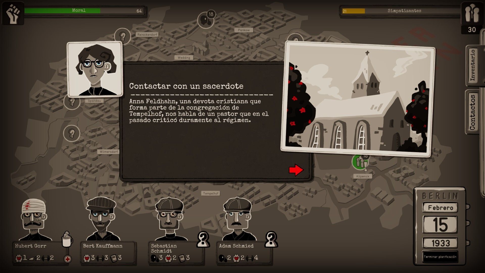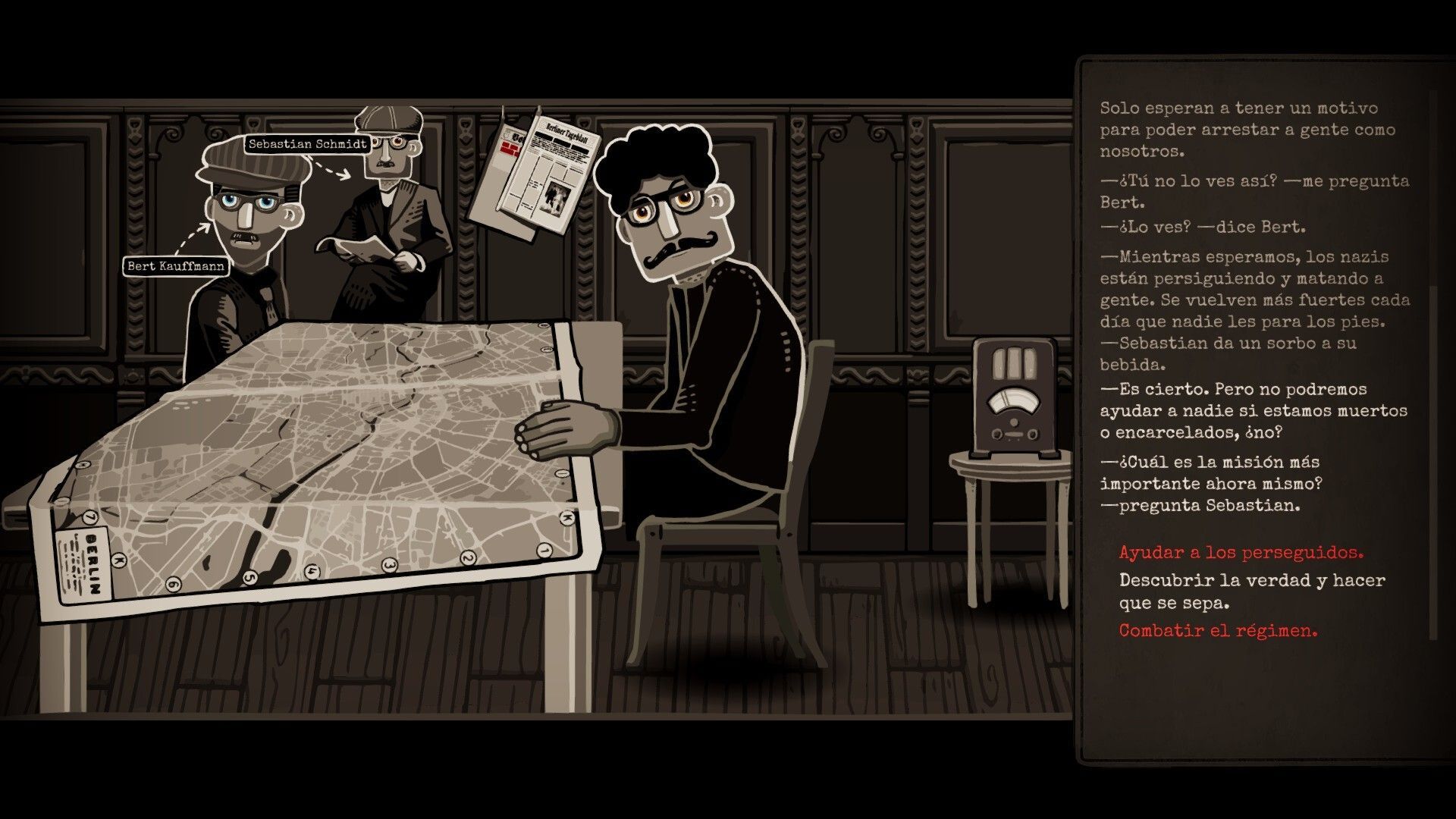 La parte puramente jugable peca de simpleza en sus mecánicas, pero la importancia de este aspecto dependerá mucho de cada jugador. A nosotros en este caso no nos ha parecido un fallo excesivamente grave, pues en ningún momento aspira a destacar en este apartado, sino ser un acompañamiento a la narrativa y el mensaje general. El objetivo en este caso es liderar un grupo de varios personajes principales para que resuelvan una serie de misiones dentro de unos turnos limitados, encargos que pueden consistir en hablar con los obreros para sumar simpatizantes, protestar en el Tiergarten, contactar con un sacerdote crítico con el régimen, recoger donaciones que aumenten nuestros ahorros, filtrar las barbaridades nazis a la prensa, refugiar judíos…