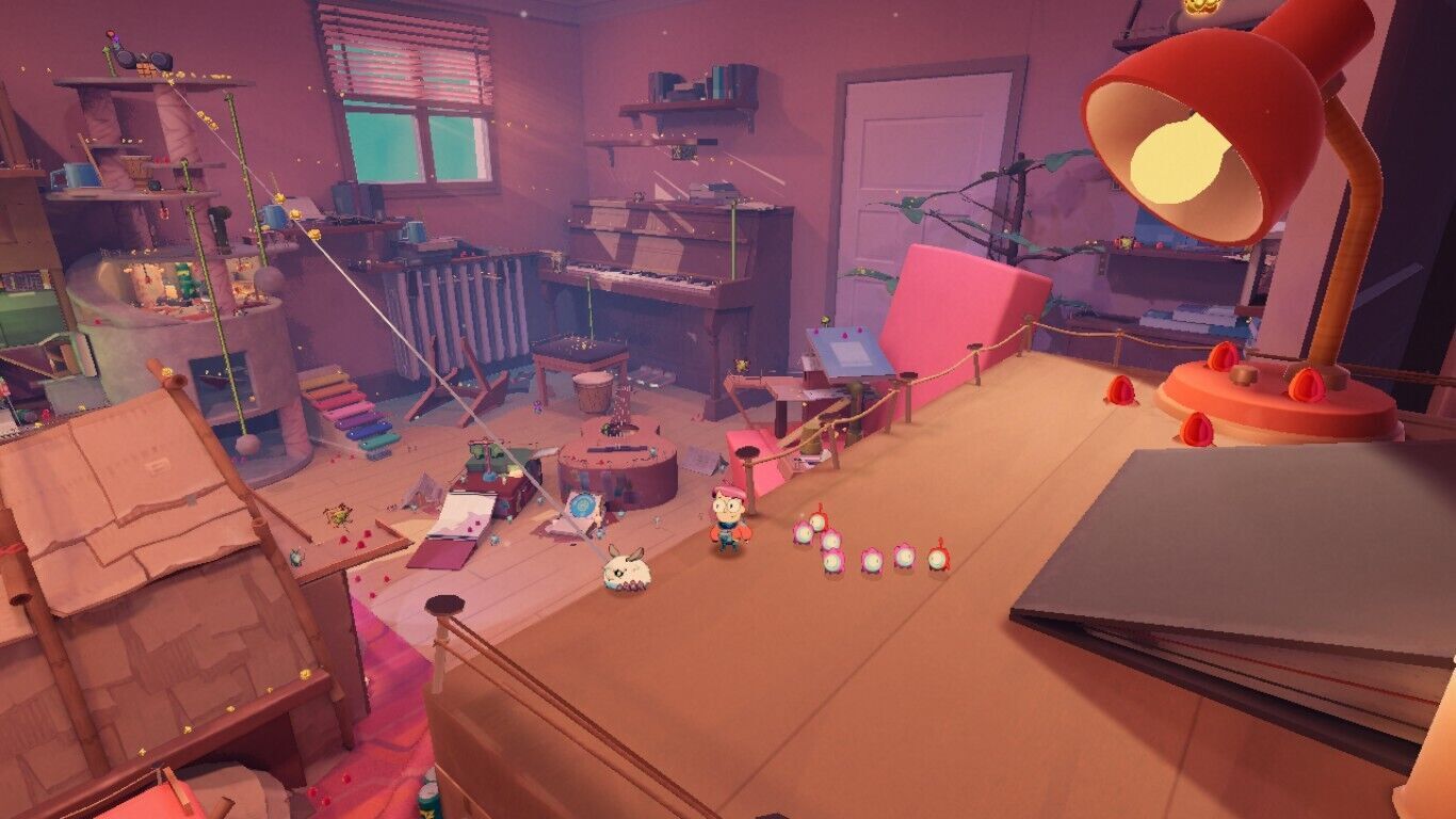 Por último, no podemos acabar sin alabar el cuidado apartado audiovisual de Tinykin. Su dirección artística está pulida hasta el más mínimo detalle, destacando lo bien que funciona la mezcla entre la profundidad de sus exuberantes mundos 3D con la sencillez de los diseños 2D de los personajes; este último estilo también está muy bien aprovechado en breves cinemáticas que aparecen de vez en cuando, que bien podrían pertenecer a una serie de animación. También su diseño sonoro es especialmente bueno, tanto en la propia música como en los simpáticos efectos de sonido que no paran de sonar durante toda la aventura. Además hay un trabajazo en la inmersión a través del audio, con la música sonando hueca cuando nos metemos debajo de una alfombra, por ejemplo, o las notas del tema principal cambiando a algo más tenue cuando entramos en una iglesia.