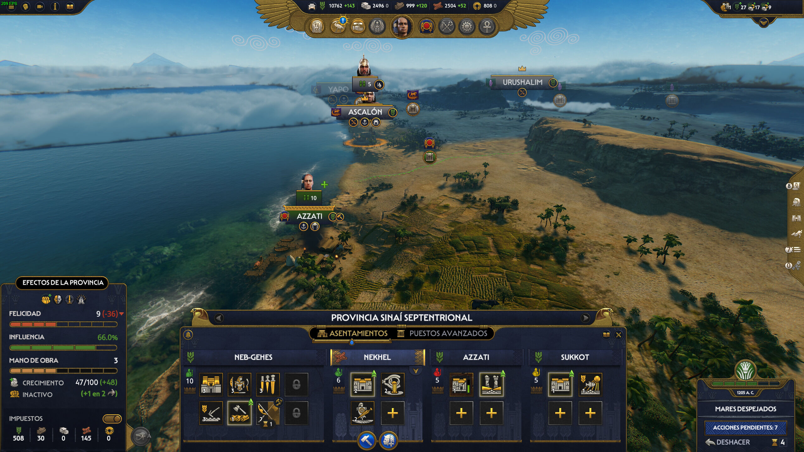 Por otro lado, en esta entrega creemos que hace falta un ajuste de balance en cuanto a la ofensiva y a la defensa, ya que ser pasivos y protegernos de los ataques en lugar de llevar la iniciativa es demasiado beneficioso en Total War: Pharaoh, sobre todo gracias a los nuevos fuertes que podemos construir entre diferentes ciudades, algo que favorece a las facciones más grandes y pone las cosas mucho más difíciles si queremos comenzar con un general o héroe con poco territorio, héroes que, por cierto, podrían estar mejor aprovechados y ser algo más carismáticos.