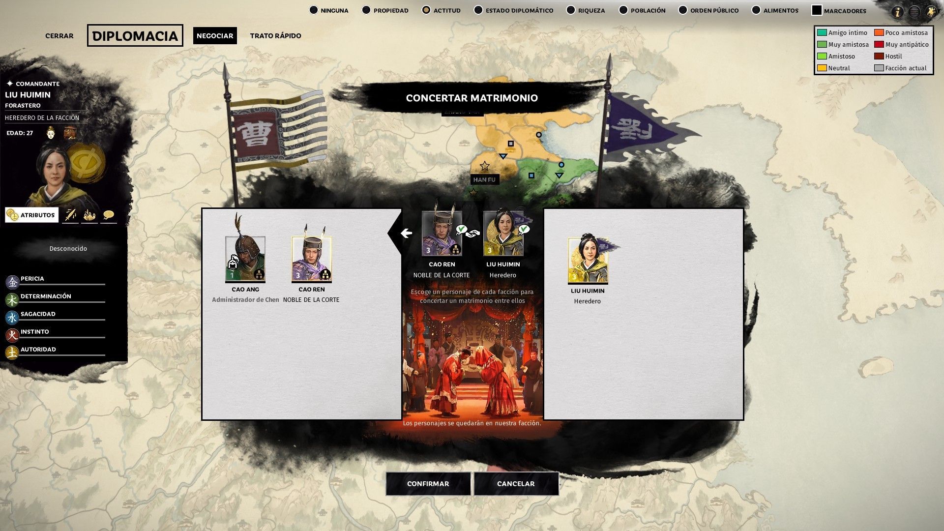 Las relaciones personales no se limitan a guerrear; también en la corte hay que tener en cuenta la satisfacción de cada personaje (que se modifica subiendo su estatus, dándole un cargo o tarea o asignándole un objeto que tenga esa capacidad) porque alguien con posición fuerte en la corte que se sienta mal puede irse o rebelarse, utilizando las tropas que forman parte de su séquito. Es el sistema Guanxi basado en la cultura china en la que las relaciones interpersonales son el entramado que define toda la vida social, cultural y política del país.