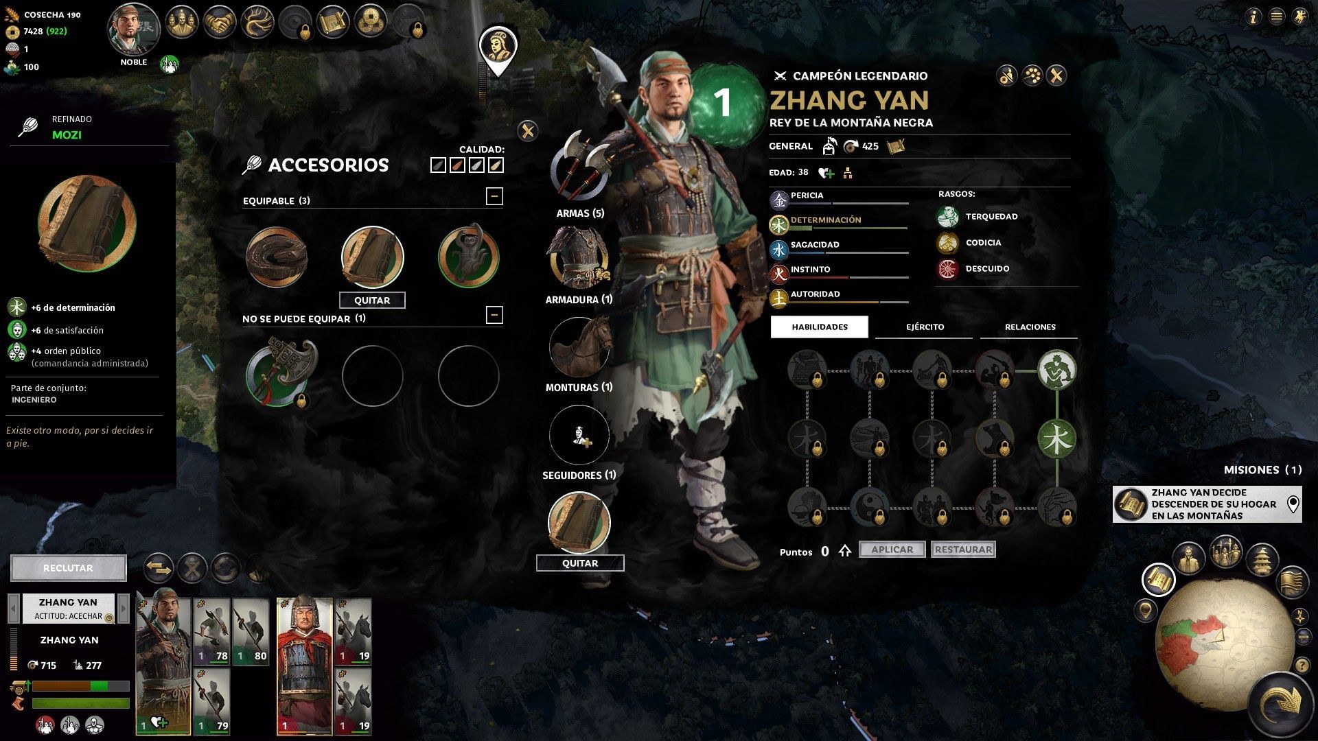 Esto podría definir el papel de cada personaje, pero en Three Kingdoms casi todo puede reescribirse, y el árbol de habilidades de cada elemento es igual para cada elemento, pero puede que en cada personaje empiece en un punto diferente y, si vamos sumando puntos de otro elemento irá cambiando sus estadísticas y también sus rasgos, lo que influye en el desarrollo del juego. Esto se ve también de forma muy gráfica porque cada personaje tiene cinco características (pericia, determinación, sagacidad, instinto y autoridad) que lo hacen más adecuado para una función u otra de forma que llevemos al campo de batalla a quien inicialmente estaba destinado a ser un funcionario de la corte.