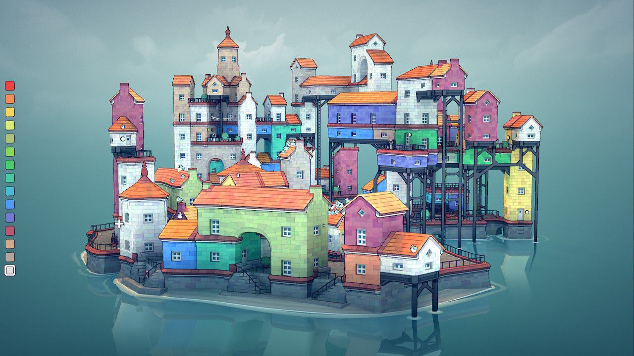 Y es que la magia de Townscaper es todo lo que oculta entre bambalinas para que cualquier improvisación urbanista acabe devolviéndonos una composición estética. Apenas podemos tomar decisiones con respecto a lo que sucede en la ciudad, más allá de escoger dónde queremos que se construya un nuevo bloque: el propio juego se encargará de conectar las casas del mismo color creando estructuras a veces más imposibles que otras. Poco a poco iremos entendiendo su lógica para poder tener más autoridad sobre lo que sucede, pero siempre dejándonos llevar por las conexiones automáticas que crea el propio juego.