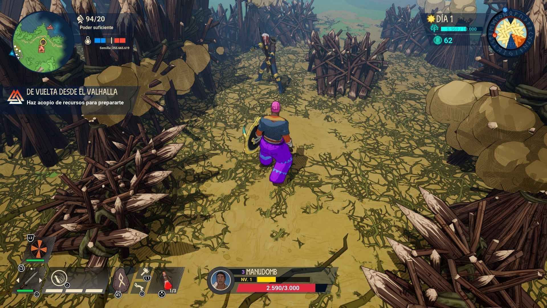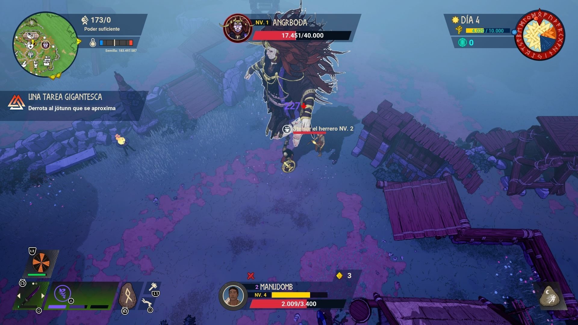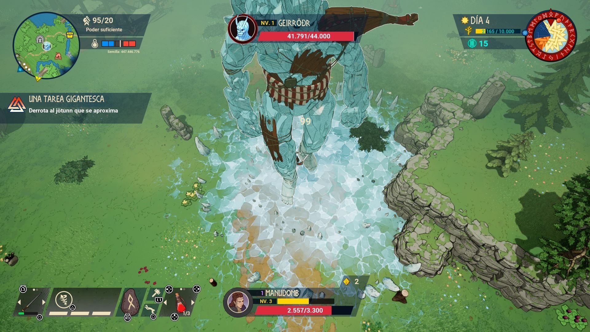 Aunque hay varios modos de juego, tanto en cooperativo como en solitario, todos se sustentan en una idea básica: defender el árbol central de la tribu, ese que ha nacido de una de las semillas de Yggdrasil, de las hordas de alimañas que llegan cada noche a la aldea. Hay un ciclo día/noche que nos permite dedicar las jornadas primero a prepararnos recolectando recursos y experiencia, para después poder hacer frente a esos enemigos que surgen cuando cae el Sol. Llegado un punto de la partida ya no sólo habrá que luchar contra esas criaturas, sino que llegará un gigante, un jötunn, que también intentará destrozar el árbol de nuestra tribu.