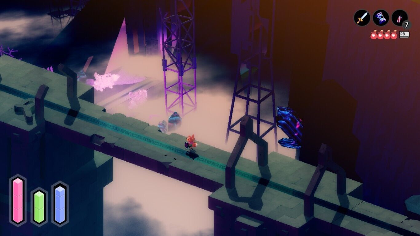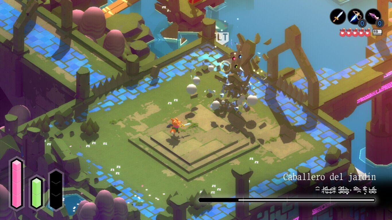 Poco a poco nos vamos dando cuenta de que el sistema de combate de TUNIC persigue una muy buena intención de diseño: mantener simple las acciones básicas, golpear y esquivar, para buscar la profundidad en otros aspectos. Los propios enemigos también nos brindan oportunidades para acabar con ellos, como cuando utilizamos la trayectoria de los proyectiles de un enemigo para que impacten en otro. Este tipo de situaciones se da en bastantes ocasiones y están ahí para que nos percatemos de esas reacciones de forma emergente, sin que el propio juego nos indique que es posible vencer a los enemigos así. TUNIC juega muy bien con ese abandono del jugador para que sea él mismo quien aprenda a cogerle las vueltas al juego.