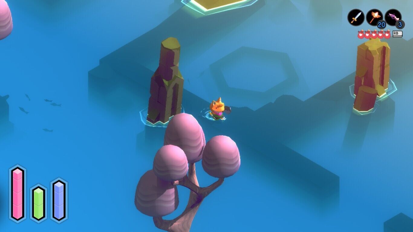 Comencemos hablando del sistema de combate, que es la principal vía de interacción con el mundo de TUNIC: es más bien simple de primeras, con un botón para atacar, otro para esquivar y uno para mantener fijado al objetivo, pero lo solventa con la integración de herramientas adicionales que le dan un toque de vidilla al asunto. Cuando desbloqueamos los petardos, por ejemplo, podemos comprarlos para lanzárselos a los enemigos que tengan escudo y dejarles vendidos. También sirve como proyectil al uso, obviamente, pero ese grado de interacción con los diferentes tipos de contrincantes le da una profundidad inesperada al sistema de combate: hay que comprender a los enemigos, buscar la forma de acabar con ellos cuando la espada no vale, y encontrar la manera de zafarnos de grandes grupos cuando nos rodean de repente.