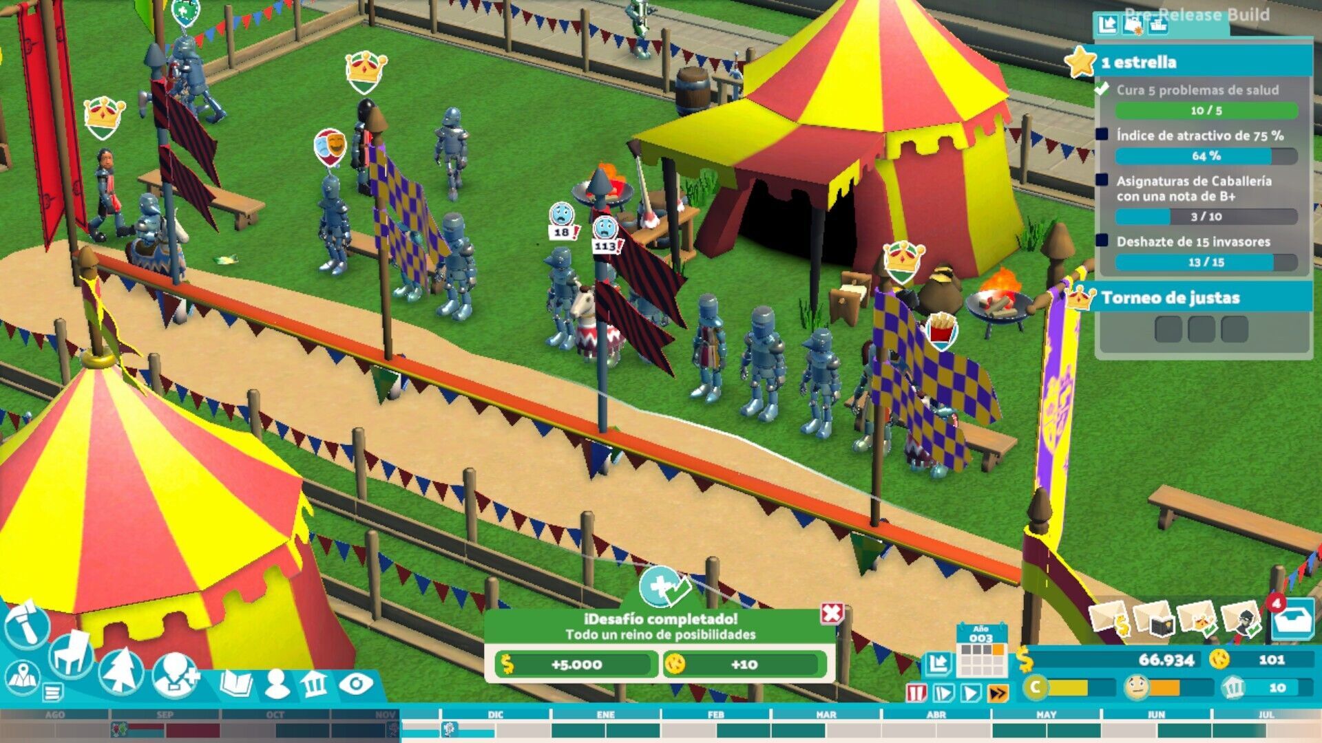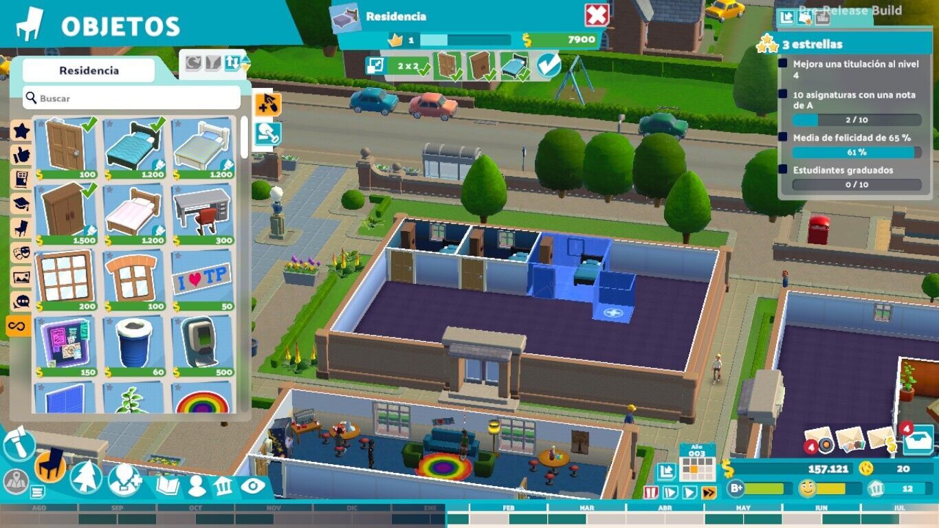 De hecho, el propio ciclo de juego ya propicia esa interacción continua: aprovechando que estamos gestionando una universidad, cada nivel tendrá una línea de tiempo que avanza día a día, mes a mes, hasta completar un año escolar. Al final de cada curso veremos los resultados, premios y notas de nuestros alumnos, y antes de comenzar el siguiente podemos realizar cambios en el campus: desde inaugurar nuevas titulaciones hasta abrir nuevas salas, contratar más personal o poner bonitos los edificios ahora que tenemos un tiempo de vacaciones. Durante este impás no hay prisa, no corre el tiempo; el curso no empieza hasta que pulsemos el botón, por lo que podemos hacer todos los ajustes que queramos antes de que los estudiantes vuelvan a inundar los pasillos con su ajetreo.