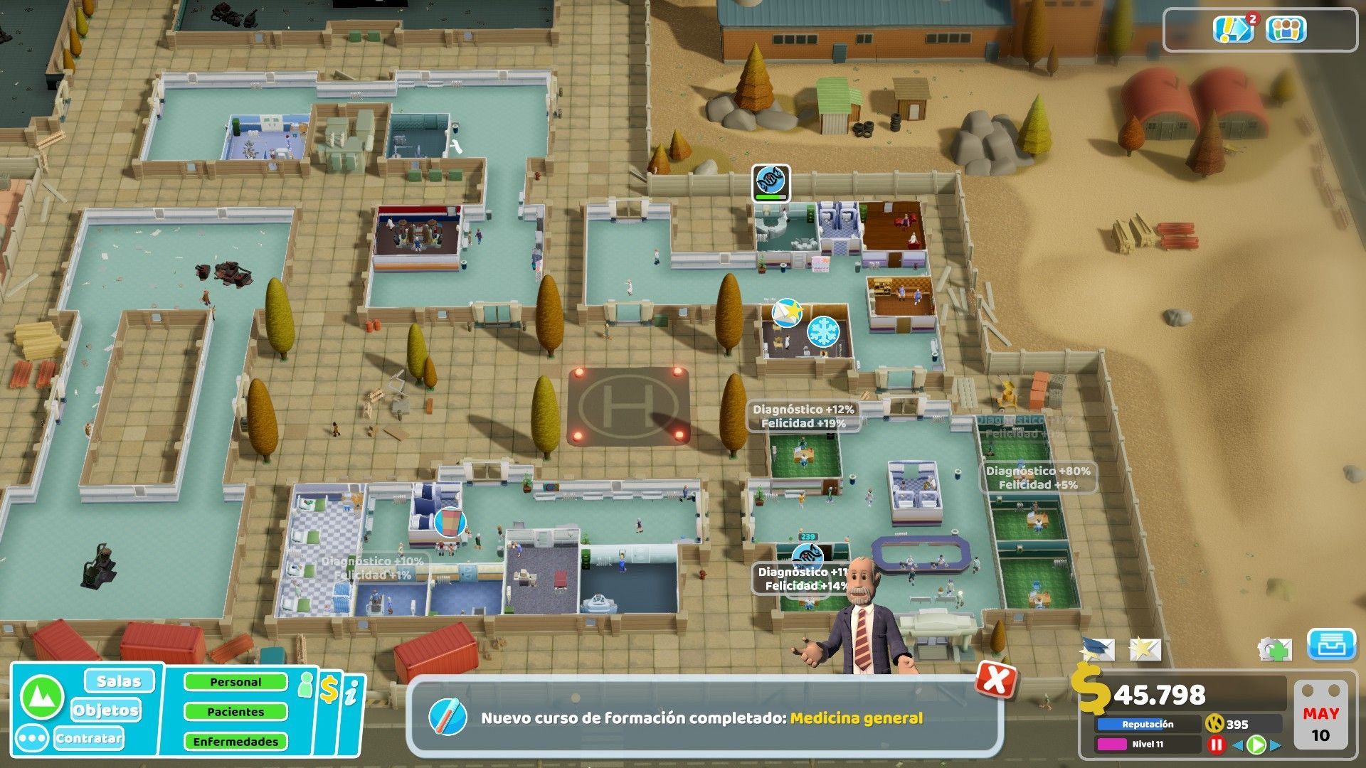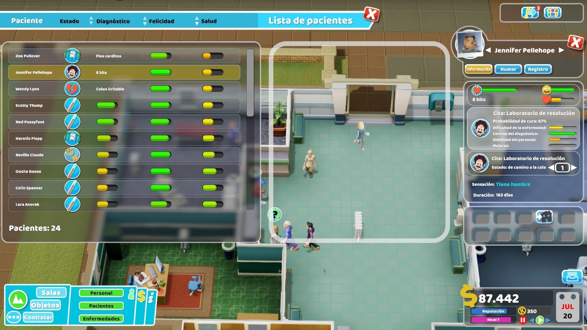 La inteligencia artificial del juego funciona bien, solo en una ocasión un enfermo se quedó indeciso sin saber qué camino tomar ni cómo llegar a una consulta que sí alcanzaba el resto. Incluso hay que estar muy pendiente de lo que hace cada profesional porque alguno puede resultar demasiado torpe pese a poseer la calificación necesaria y tener un porcentaje de curaciones realmente bajo, así que lo mejor es despedirle antes de que caiga la reputación del hospital.
