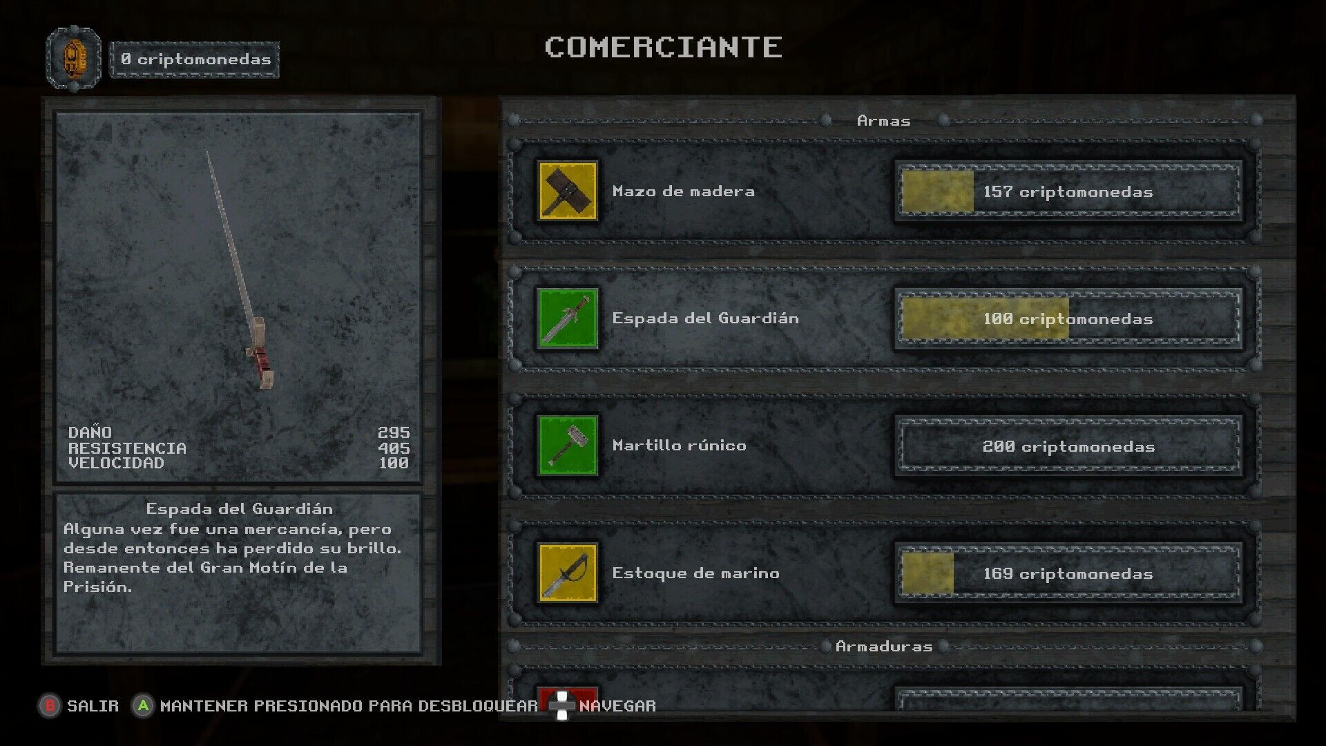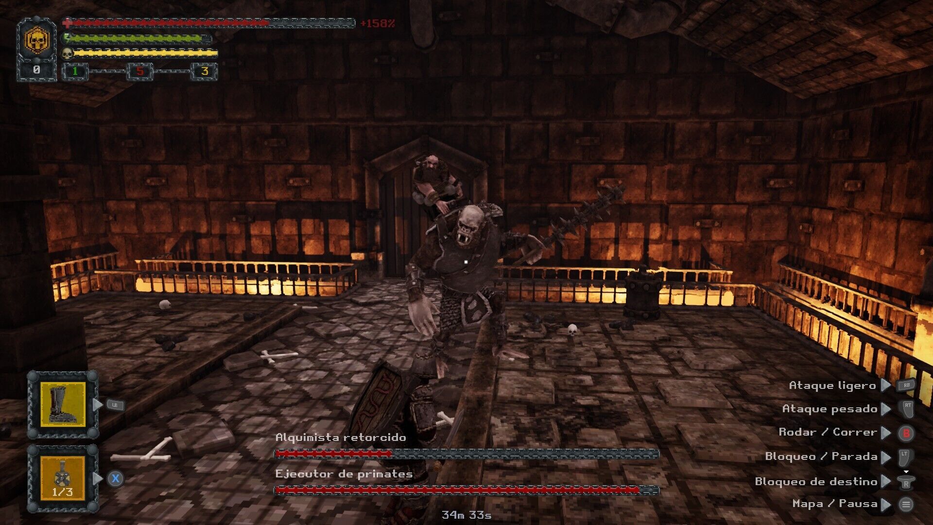 El equipamiento ofrece suficiente variedad jugable como para que merezca la pena experimentar. Existen espadas más grandes y pesadas, así como más pequeñas y ágiles. Con el resto del equipamiento, en cambio, por lo general no existe una diferencia en peso que se refleje en tu forma de acercarte al combate. Aquí, cuanto más defensa, mejor, lo cual simplifica las elecciones un poco en detrimento de un tipo de juego centrado en el ensayo-error. A cambio, tanto armaduras como escudos ofrecen habilidades activas o pasivas. En el caso de las activas, pulsando un botón podremos infectar nuestra arma de veneno o lanzar un pisotón que daña a varios enemigos a la vez, entre otras. Es aquí donde algunos equipamientos permiten usar armas arrojadizas, ausentes en el principal. Luego, los potenciadores pasivos pueden ayudar a hacer más daño a los jefes, a que los enemigos te den más dinero (con el objetivo de desbloquear más armas y mejoras) o que te curen a cambio de tener la mitad de vida. Para los más duchos en el género roguelike hay pocas sorpresas en las mejoras que te ofrece: aumentar tu máximo de pociones (que rellenas en la Cámara del Comerciante), la posibilidad de saltarte jefes, o tener armas un poco más avanzadas desde el minuto uno.