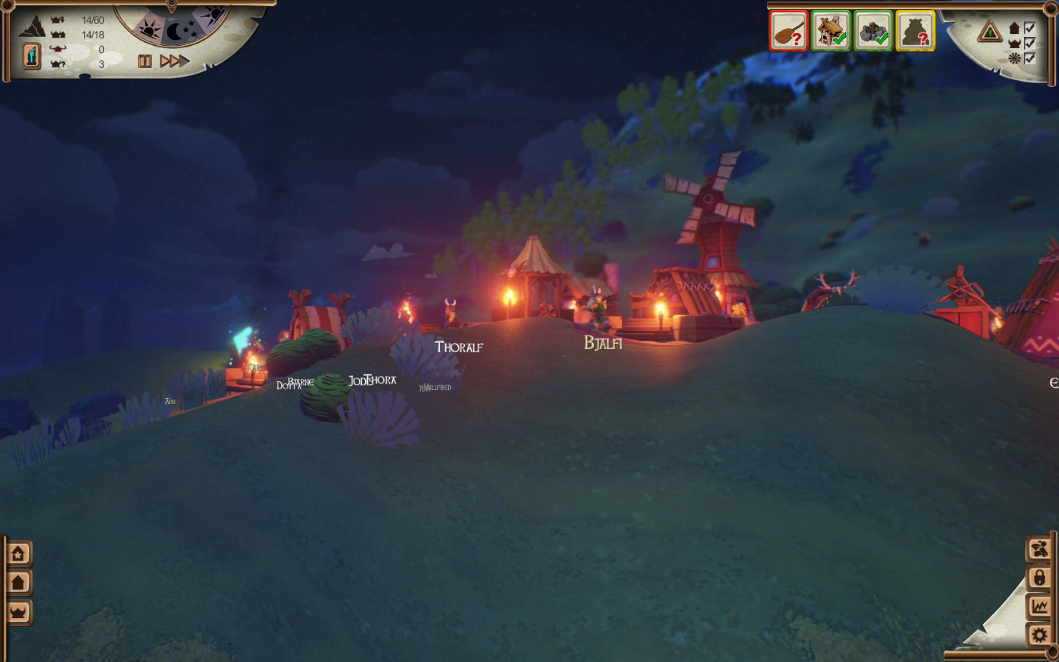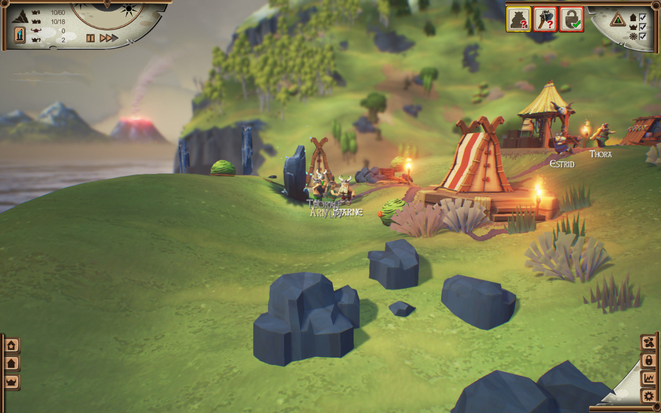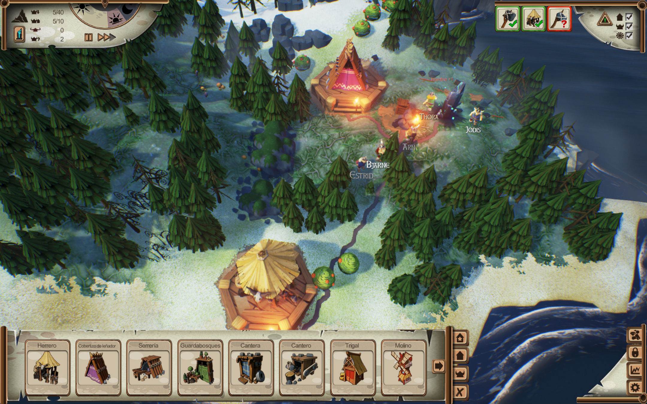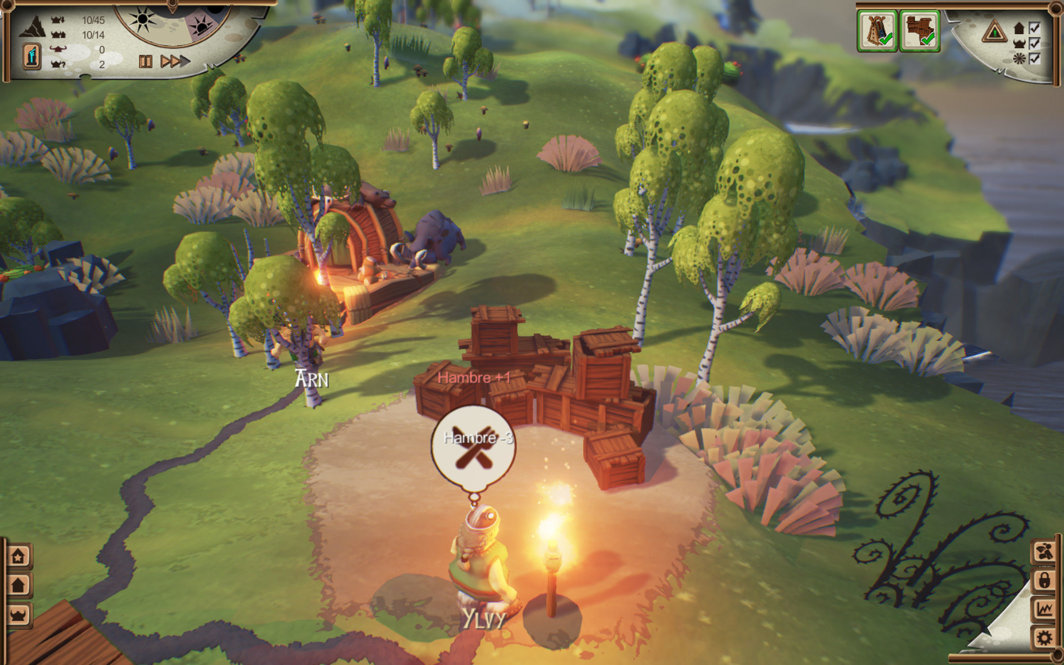 Cada colina comienza con un tótem de entrada de los vikingos dónde habrá además materiales suficientes para arrancar a construir. En el momento que demos ordenes de construcción de cosas básicas como casas, almacenes o la casa del leñador, nuestros habitantes automáticamente se gestionarán la tarea entre ellos y si el edificio es necesario que tenga algún habitante para funcionar se asignará. Para ahorrarnos ciertas esperas tenemos acceso a tres velocidades para el paso del tiempo, y la IA de los vikingos suele ser bastante eficiente, pero a los amantes de la micro gestión les puede sacar de sus casillas ver como a veces tardan en organizarse. Una herramienta creada a la espera de que la coja el único que la puede usar, o un edificio lleno de recursos sin utilizar necesarios para la construcción vecina, pueden hacerte echar de menos darles órdenes directas a tus súbditos.