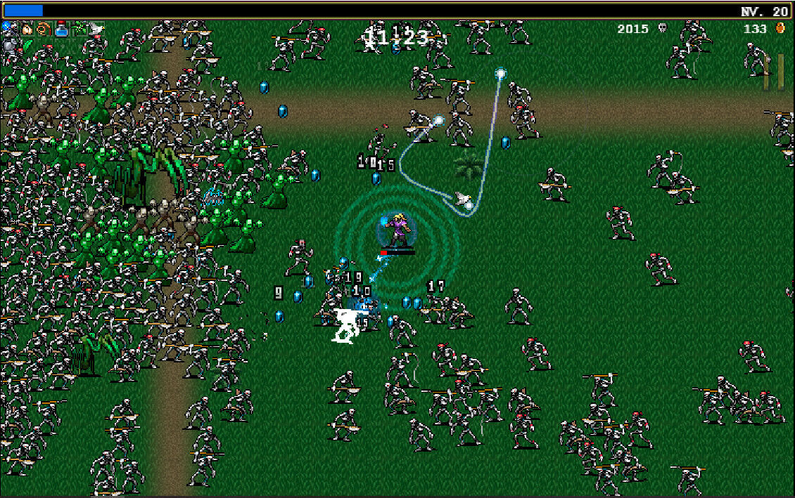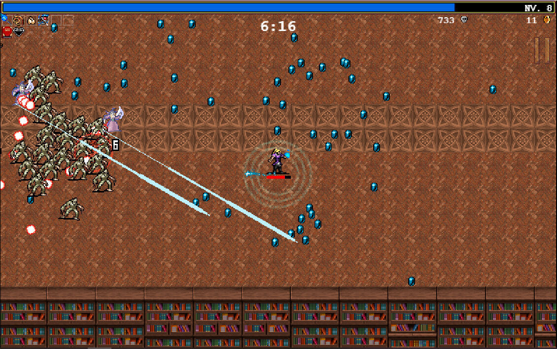 Lo cierto es que Vampire Survivors no engaña a nadie: su propuesta es la que es y le bastan cuatro teclas (las de dirección) para asentar una mecánica de juego verdaderamente original. Sus partidas consisten esencialmente en huir de los enemigos mientras el personaje, a escoger entre los muchos héroes que tenemos para desbloquear, lanza ataques de manera automática. Un temporizador marca cada segundo que hayamos sobrevivido, señalando al objetivo más básico: aguantar sin morir todo el tiempo que podamos. Por supuesto hay una barra de experiencia que se va llenando al recoger las gemas que sueltan los enemigos, así que si queremos mejorar las habilidades del personaje tenemos que enfrentarnos a ellos en vez de limitarnos a escapar.