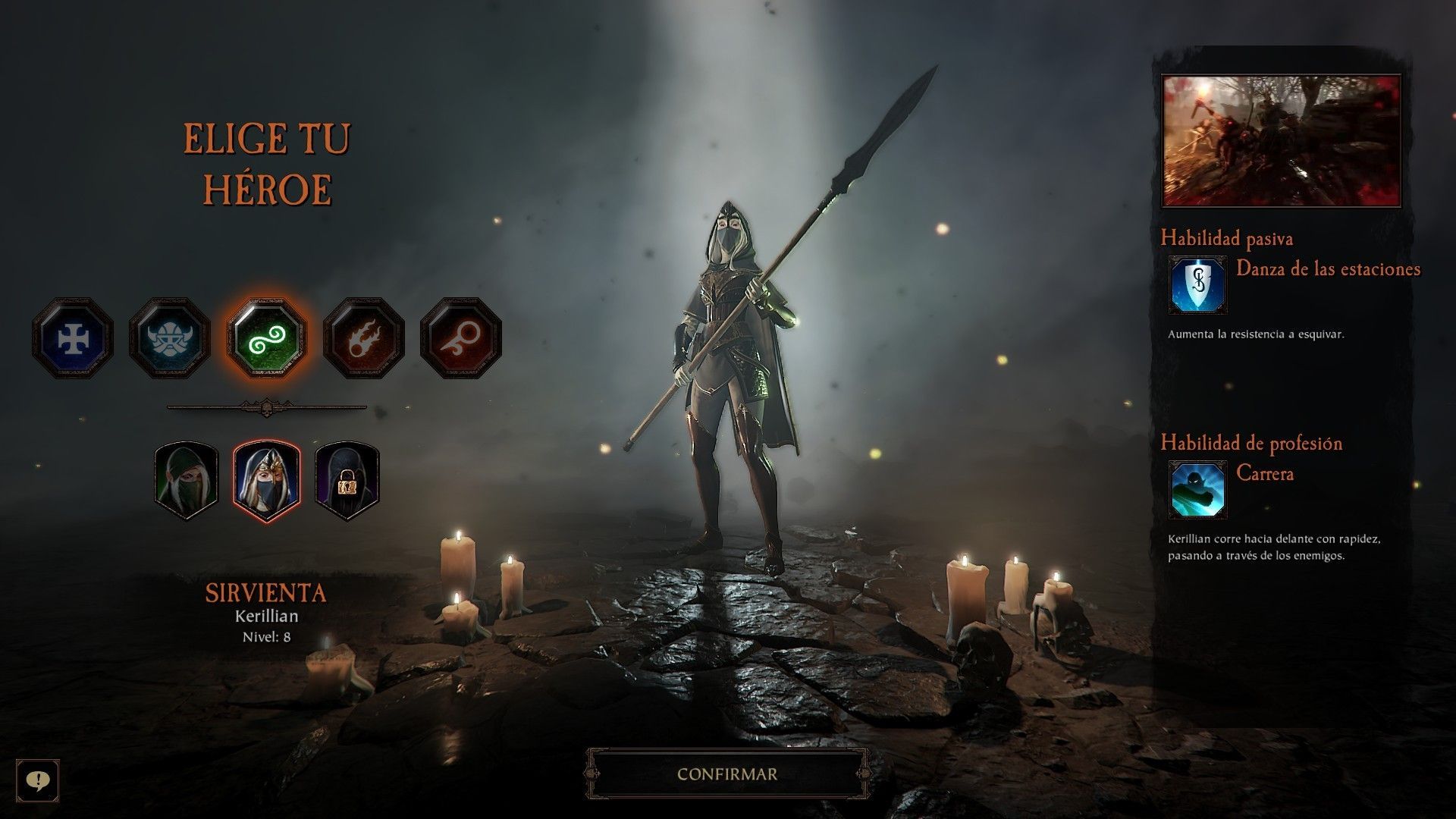 En total, son cinco los héroes que podremos controlar (Markus, Bardin, Kerillian, Víctor y Sienna). Cada héroe tendrá su propio nivel que podremos ir subiendo a medida que jugamos con él y tres profesiones diferentes que desbloquearemos en los niveles 1, 7 y 12.