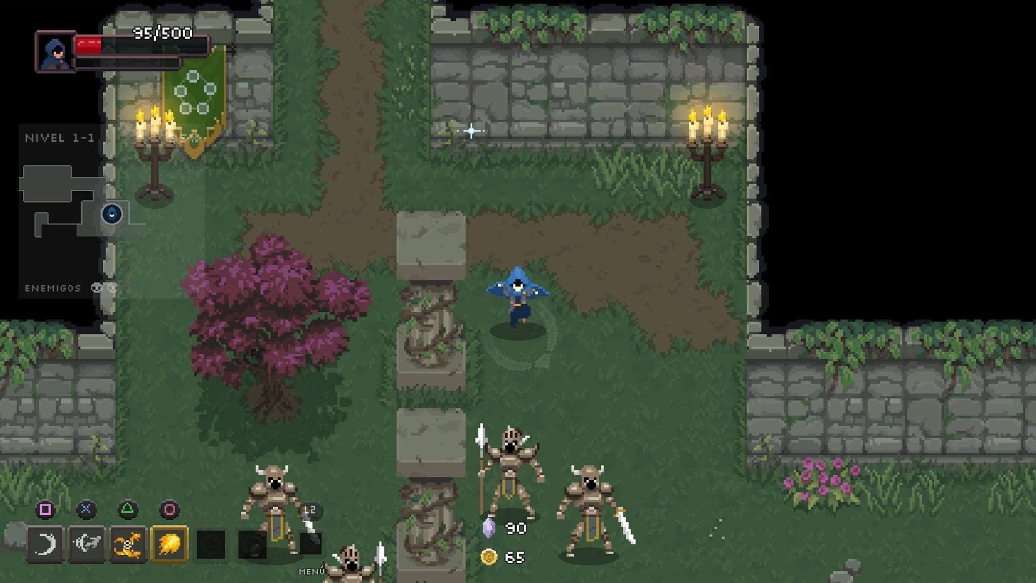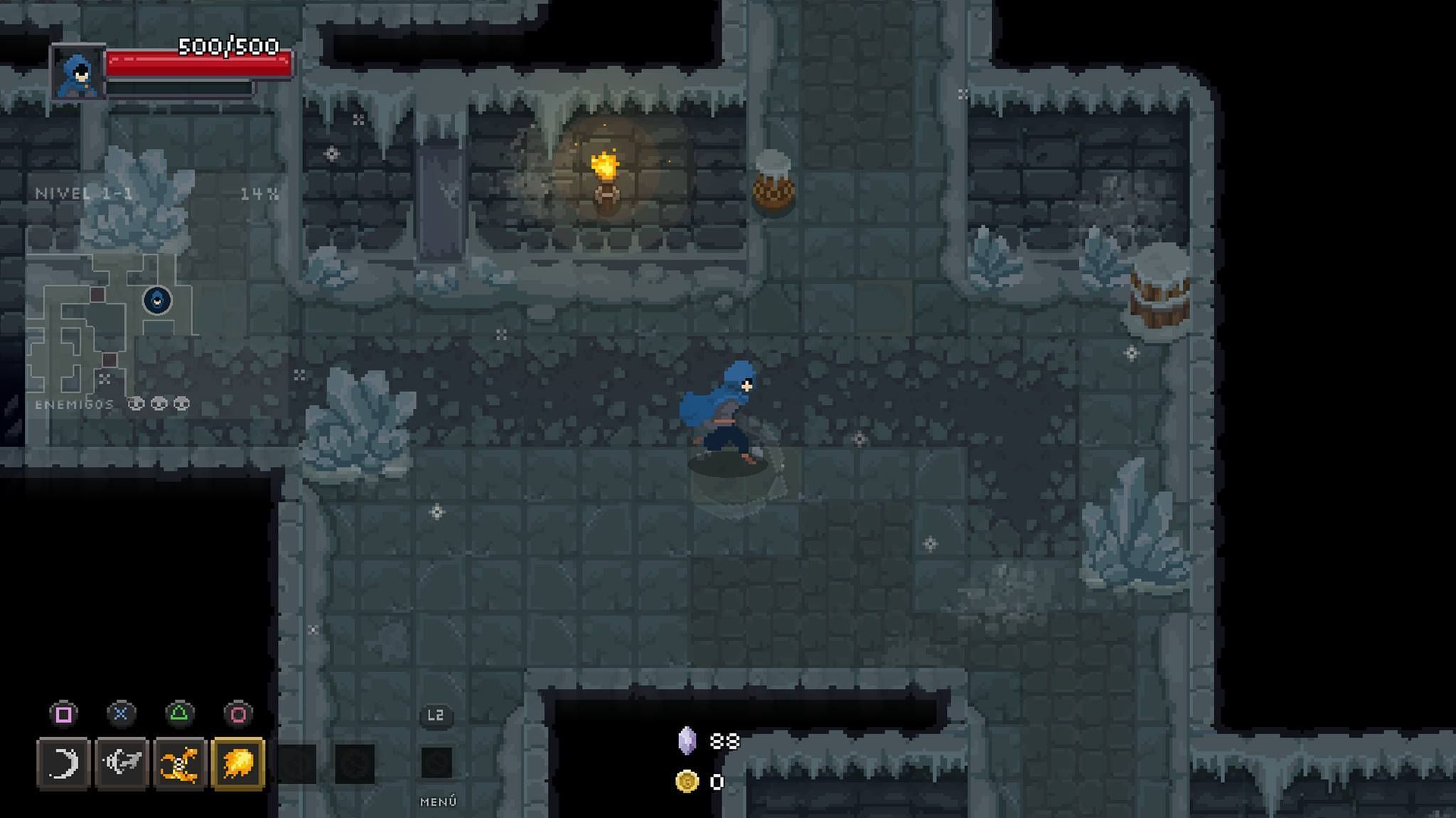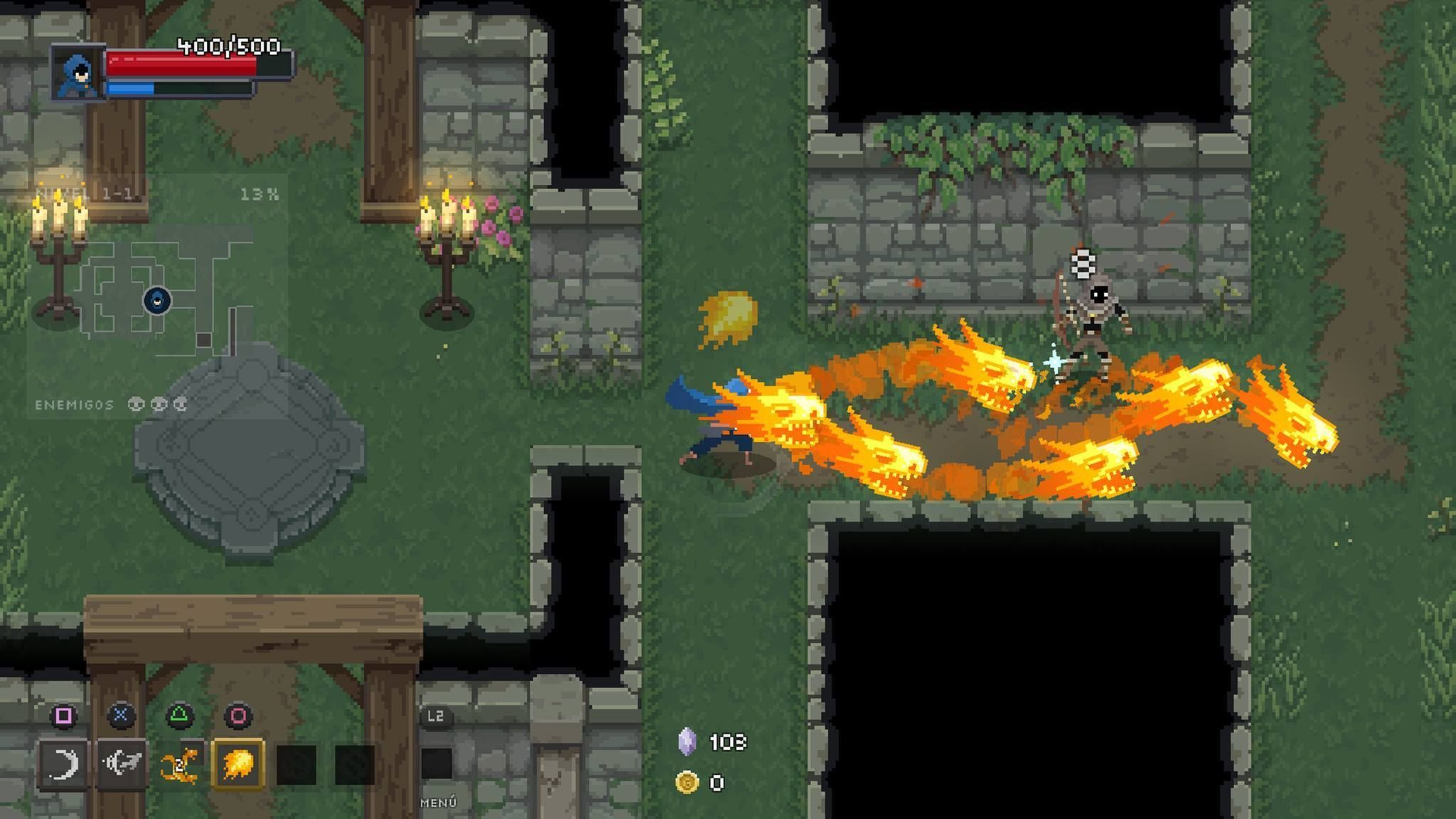 Tenemos un ataque básico a corta distancia y una evasión/teletransporte que hace el juego bastante rápido –si bien el espacio y los obstáculos o fosas suelen limitar nuestros movimientos-, mientras que los enemigos se lanzarán a por nosotros o harán uso de sus proyectiles. Hasta aquí, pocas o ninguna novedad.