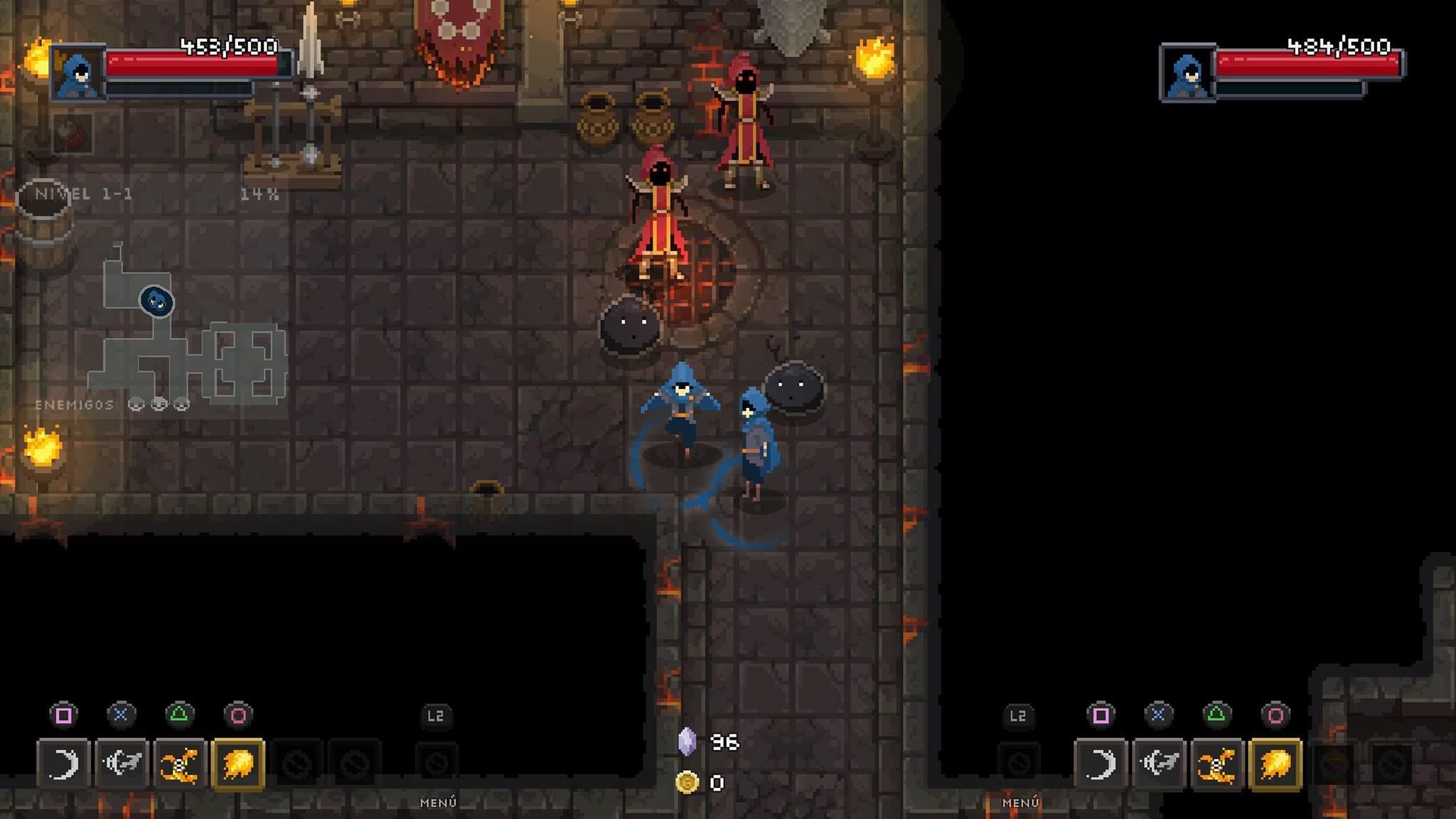 Más interesante es el modo cooperativo, donde la mecánica es la misma que en solitario, pero con un segundo jugador que puede contar con habilidades muy diferentes a las nuestras, permitiendo diferentes estrategias que complementen a las nuestras. Por ejemplo uno de los personajes quizás esté orientado al lanzamiento de proyectiles mientras que otro sea más letal en cortas distancias. Los jugadores deben estar siempre en la misma pantalla –o sea que olvídate de explorar la mazmorra a pantalla partida para cubrir el mapa más rápidamente-, pero sin duda da más juego contra los enemigos.