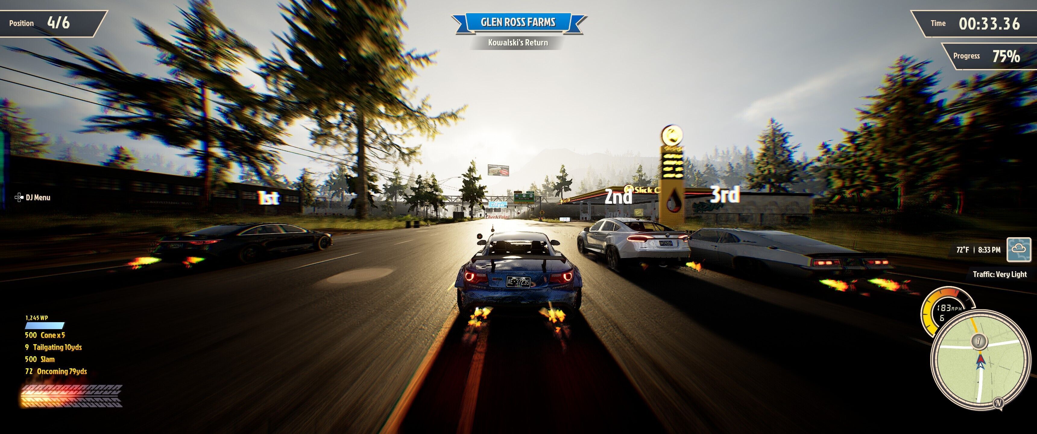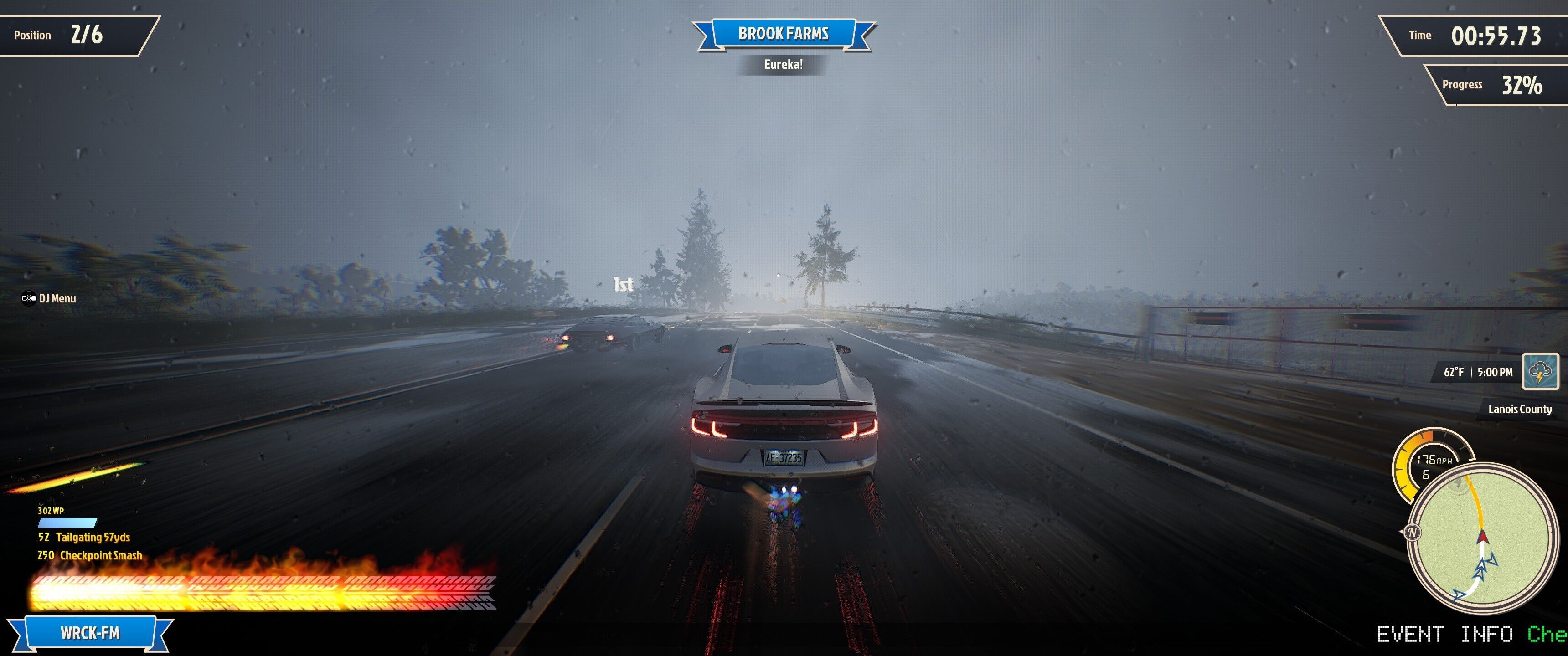 Audiovisualmente, Wreckreation cumple con solvencia. Los coches se ven muy bien, los efectos de destrucción son muy buenos, los entornos están bien diseñados y la sensación de velocidad es constante. No es un título de gran presupuesto, pero se nota que el equipo ha sabido elegir dónde invertir sus recursos. En el equipo que veis bajo este texto no hemos tenido problemas para jugar con todo en alto a 60 imágenes por segundo y a 1440p, pero sí que hemos encontrado bastantes tirones en zonas puntuales. No estamos seguros de si ha sido shader compilation o los stutters de Unreal Engine, pero en cualquier caso no ha sido nada grave. Eso sí, tienen que contratar a alguien para que les haga la interfaz.