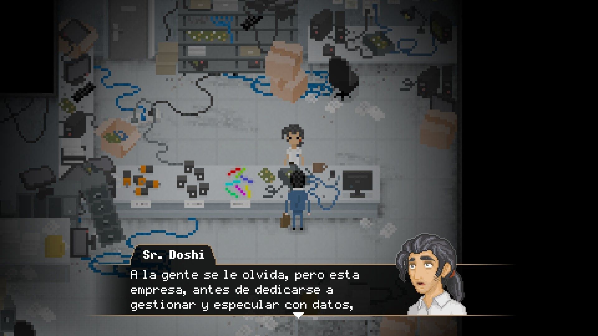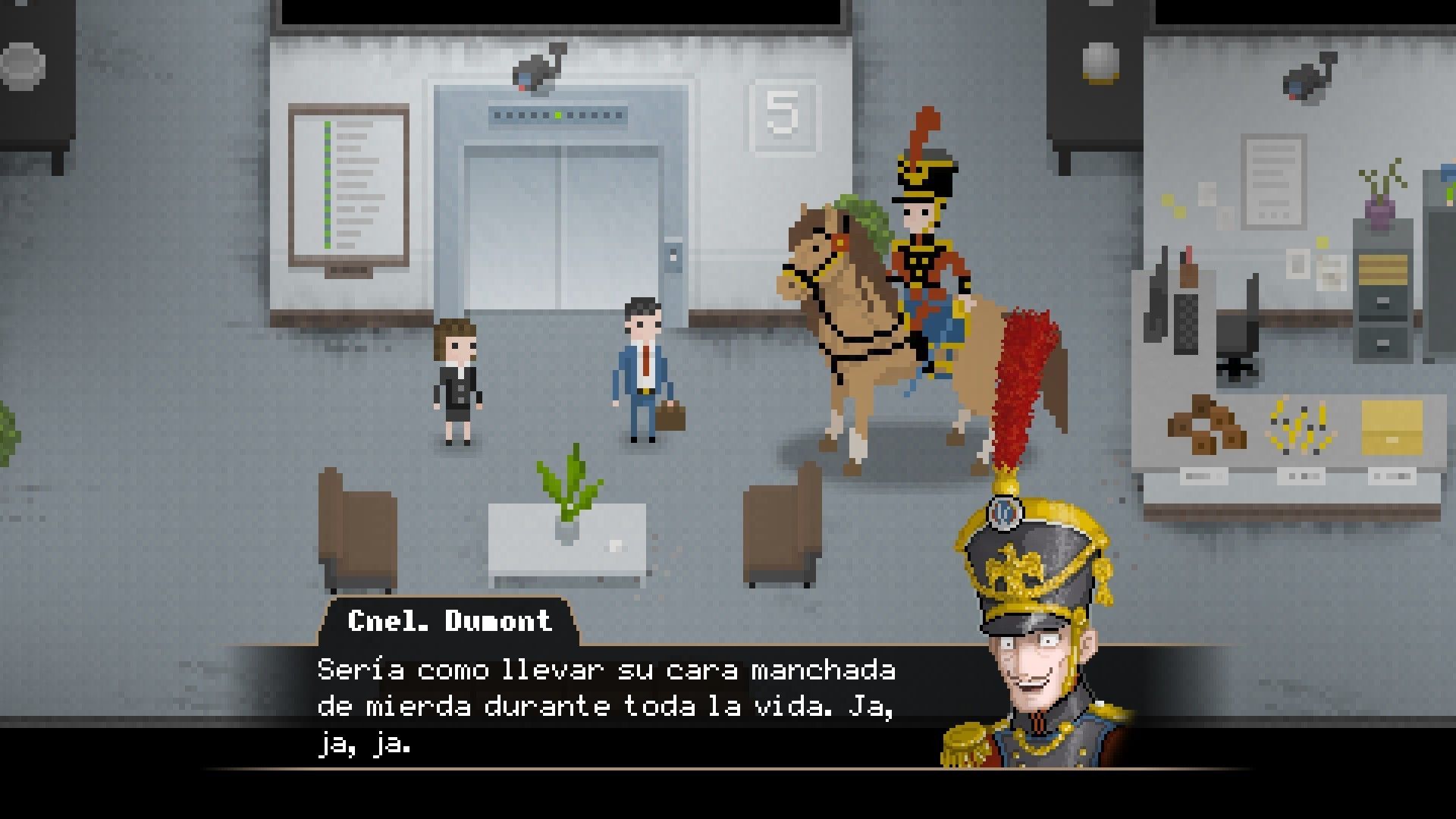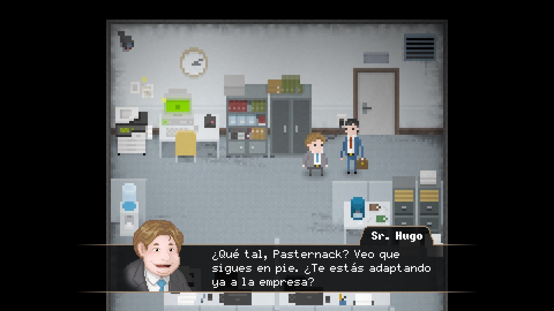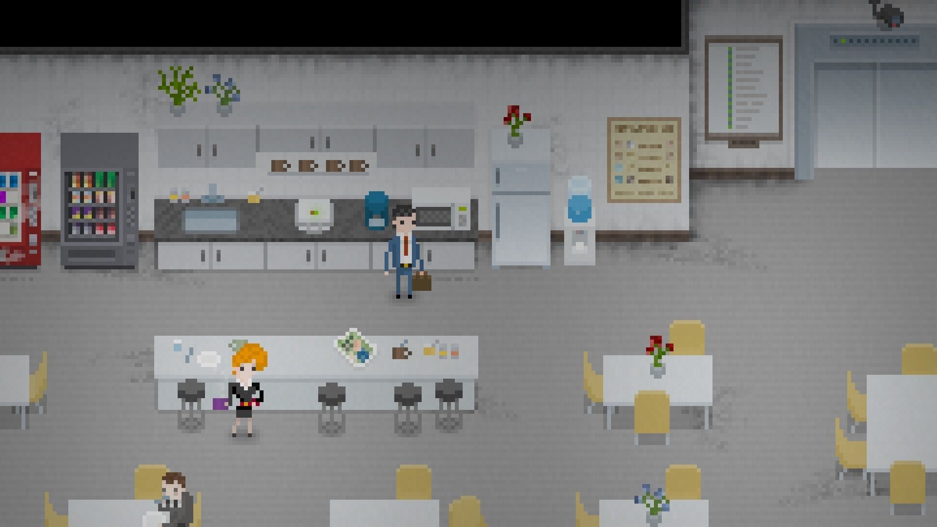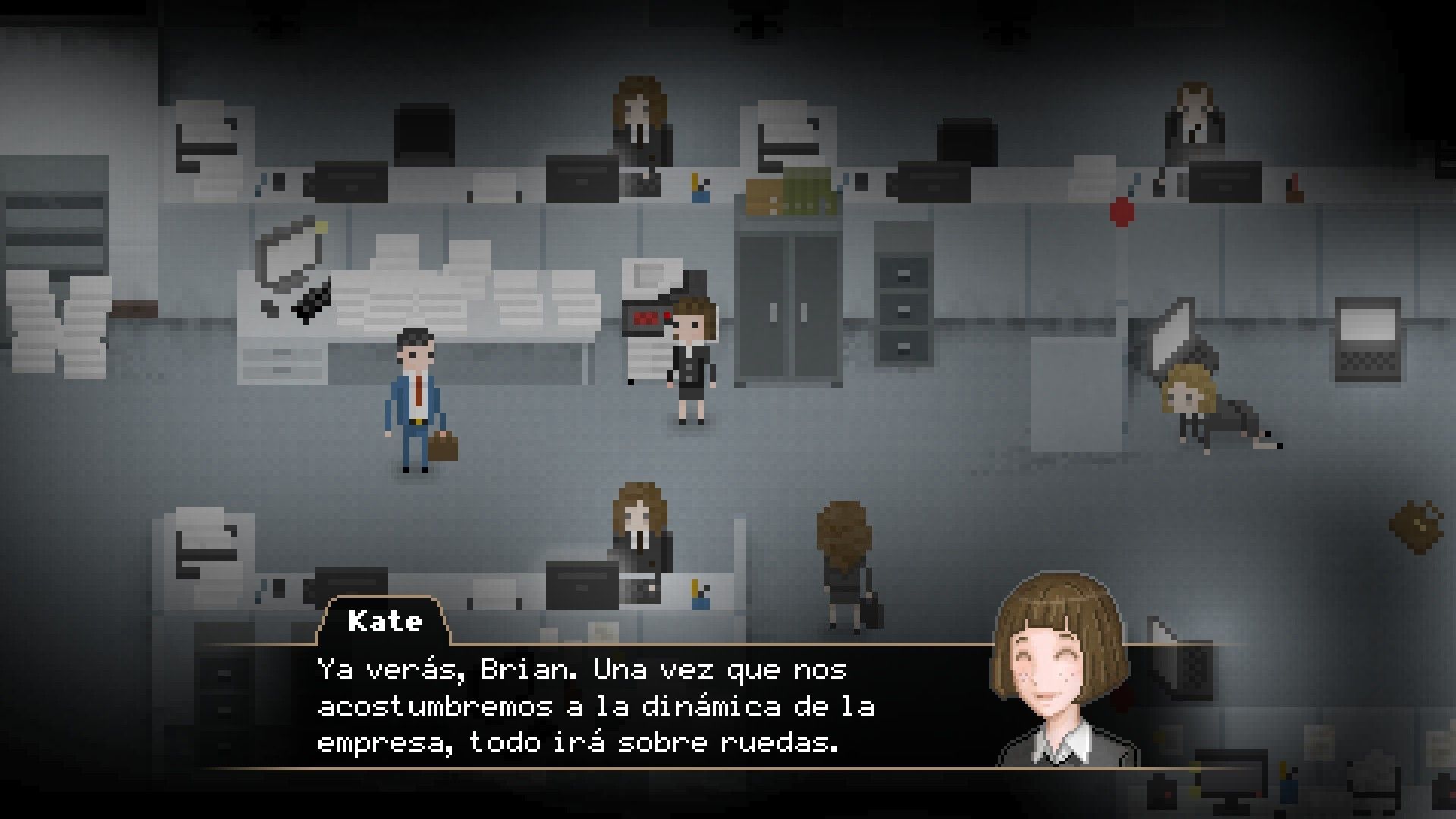 Quizás el único apartado que no resulta demasiado sorprendente es el gráfico, y no tanto por el uso del pixel-art, sino porque la propia limitación del edificio no da mucho de sí. Sin revelar mucho: sabe jugar con el género del terror –versiones retorcidas de la oficina- y hay zonas que directamente se alejan de los despachos –¡ni siquiera deberían existir en el interior de un edificio!-, pero en general no entra por los ojos tan fácilmente como otras producciones independientes. A excepción, por supuesto, de la galería con obras pixeladas de Suguru Tanaka.