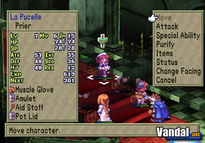 Es posible que la multitud de opciones y posibilidades que se abren ante el jugador en cada turno para cada uno de sus personajes en el campo de batalla pueda asustar a los menos dados a estos géneros, pero como es ya clásico La Pucelle cuenta con un estupendo prólogo que hace las veces de tutorial y que nos introduce de una manera muy sencilla en las estrategias básicas para garantizarnos la victoria en los primeros enfrentamientos, aunque, por supuesto, sólo las horas de juego acumuladas nos servirán para convertirnos en auténticos maestros del juego. En este sentido, la curva de aprendizaje es muy suave, pero eso no lo convierte en un título con poca profundidad jugable. Y es que la cantidad de parámetros y variables a tener en cuenta, que van desde el nivel de experiencia de nuestros personajes, hasta su clase, habilidades y debilidades, es tan amplia que en ocasiones nos puede pillar desprevenidos un enemigo cuando menos lo esperamos.