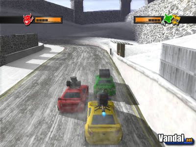 Al igual que en la versión original, Mashed XXL muestra unos entornos gráficos poco destacables. Por norma general, los circuitos son pequeños, con unas cuantas construcciones rodeando las carreteras, y con algún que otro efecto especial destacable como los reflejos de los coches en el hielo o las explosiones provocadas por los misiles. El modelado de los vehículos tampoco destaca mucho, pudiendo ver en ocasiones los destrozos provocados por los ataques de los rivales, pero tampoco sin destacar mucho en ese sentido. Y si bien es cierto que los gráficos en un juego de estas características son muy secundarios, y bien poco influyen en la nota final del análisis, tampoco podemos olvidarnos de la monotonía en cuanto a los entornos se refiere. Como decíamos, en cada escenario tendremos que disputar tres carreras distintas para conseguir los tres trofeos.