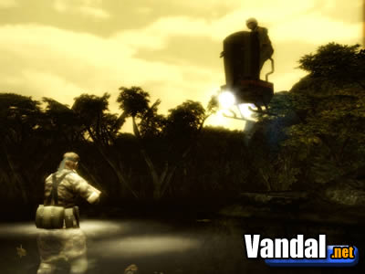 Pero el efecto que más nos llamó la atención fue el tratamiento del agua. Si todo el mundo se quedó boquiabierto con aquella corriente de agua que arrasaba el interior del carguero Discovery en el MGS2 ahora MGS3 ha dado un paso más. No es la mejor recreación de fluidos que existe, pero sin duda es algo que nunca hubiéramos creído ver en una PS2. No nos quedaríamos cortos si la comparamos al agua del Far Cry o Halo 2. Además del efecto de distorsión, podemos contemplar los peces que nadan en el fondo, la silueta de Snake reflejada y deformada, las fuentes de luces reflejadas, la distorsión producida por el chapoteo y las ondas que se mueven suavemente al compás del movimiento de Snake... es una belleza ir caminando por un lago mientras contemplamos cómo el sol irradia sus rayos en el agua. Si buceamos podremos contemplar cómo los disparos de los enemigos deforman su trayectoria al entrar en el agua y estos dejan una estela e incluso podremos ver cómo impactan en los animales cercanos. Estos detalles "japoneses" son los que hacen de éste juego una auténtica belleza.