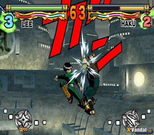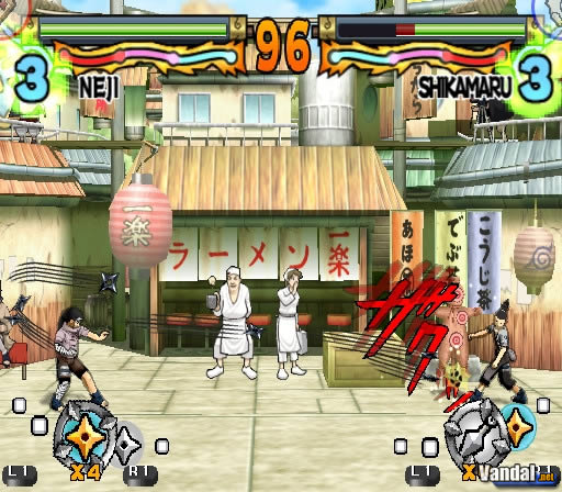 Un último botón nos servirá para hacer uso de los ataques especiales, siempre y cuando hayamos ahorrado el chakra suficiente para ello. En ese momento se activará una secuencia animada que recreará, dependiendo del personaje que tengamos entre manos, alguno de los ataques más poderosos y conocidos del mismo. Durante dicha secuencia, y para conseguir infligir más daño a nuestro rival, tendremos que pulsar rápidamente una serie de teclas por orden que se nos indicarán en la pantalla, dependiendo de esto el éxito o fracaso de nuestro ataque. Cada personaje tendrá tres ataques especiales distintos según la cantidad de chakra que tenga en el momento del uso.