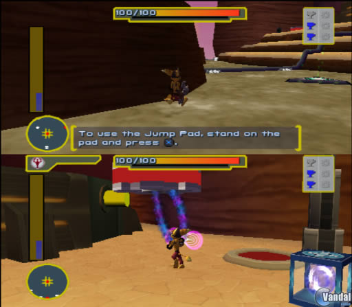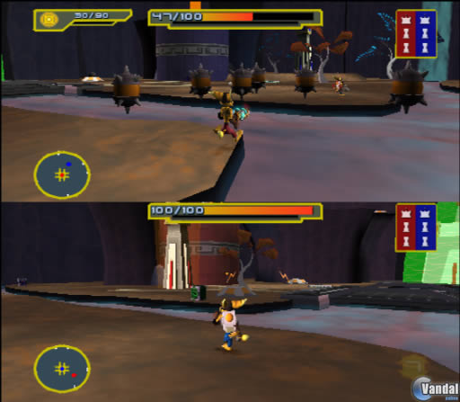 Las situaciones de esta obra son exactamente las mismas que aparecieron en su versión para la hermana pequeña de Sony en cuanto al modo aventura, por lo que si ya te hiciste con una copia del juego carece de sentido volver a tenerlo para Playstation 2. Además de las fases a pie con Ratchet también controlaremos al pequeño Clank en una serie de fases donde los puzles y la estrategia pasa a ser más importante que la acción, ya que nuestro simpático robot carece de armas y fuerza para hacer frente a los enemigos. Aún así, Clank será todo un aventurero al contar con la ayuda de unos perros robot a los que podrá dar órdenes en todo momento para atacar o resolver los diferentes puzles a los que nos enfrentaremos. Un ejemplo claro es nada más llegar a la base de lo que parece ser los Tecnomitas, una raza galáctica de la que apenas se sabe mucho, donde una puerta enorme se interpondrá entre nuestros aventureros y Luna, pero, gracias a un ligero hueco, Clank podrá introducirse y abrir la puerta desde dentro para que Ratchet pueda volver a disparar contra todo ser viviente.