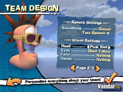 Dejando a un lado el multijugador, otra de las grandes novedades de Worms 4 son las opciones de configuración para los equipos. Con un sencillo pero variado editor podremos crear equipos a nuestro gusto y diferenciarlos, ya no solo en el nombre del equipo y el de las lombrices, sino también en el aspecto físico. Aparte de poder elegir qué conjunto de voces tendrá nuestro equipo, también podremos configurar su cabeza, su cuerpo, sus ojos... logrando así combinaciones tan graciosas como las que pueden verse en las imágenes.