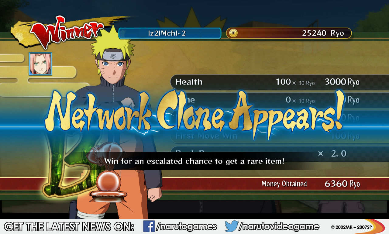 Otra novedad la encontramos en los clones de red, una opción que nos permitirá editar a un personaje, modificar sus habilidades y accesorios, y enviarle a luchar online contra otros jugadores para que entrene y suba de nivel. El resto de usuarios se podrán enfrentar a ellos en el mapa principal del modo Torneo Mundial Ninja, donde irán apareciendo aleatoriamente. Lo interesante es que cuando vuelva pasado un tiempo no solo regresará con más experiencia, sino que también traerá consigo objetos y diversas recompensas. No es que sea un añadido determinante ni nada por el estilo, pero como forma adicional de progresar y obtener objetos funciona más que bien.