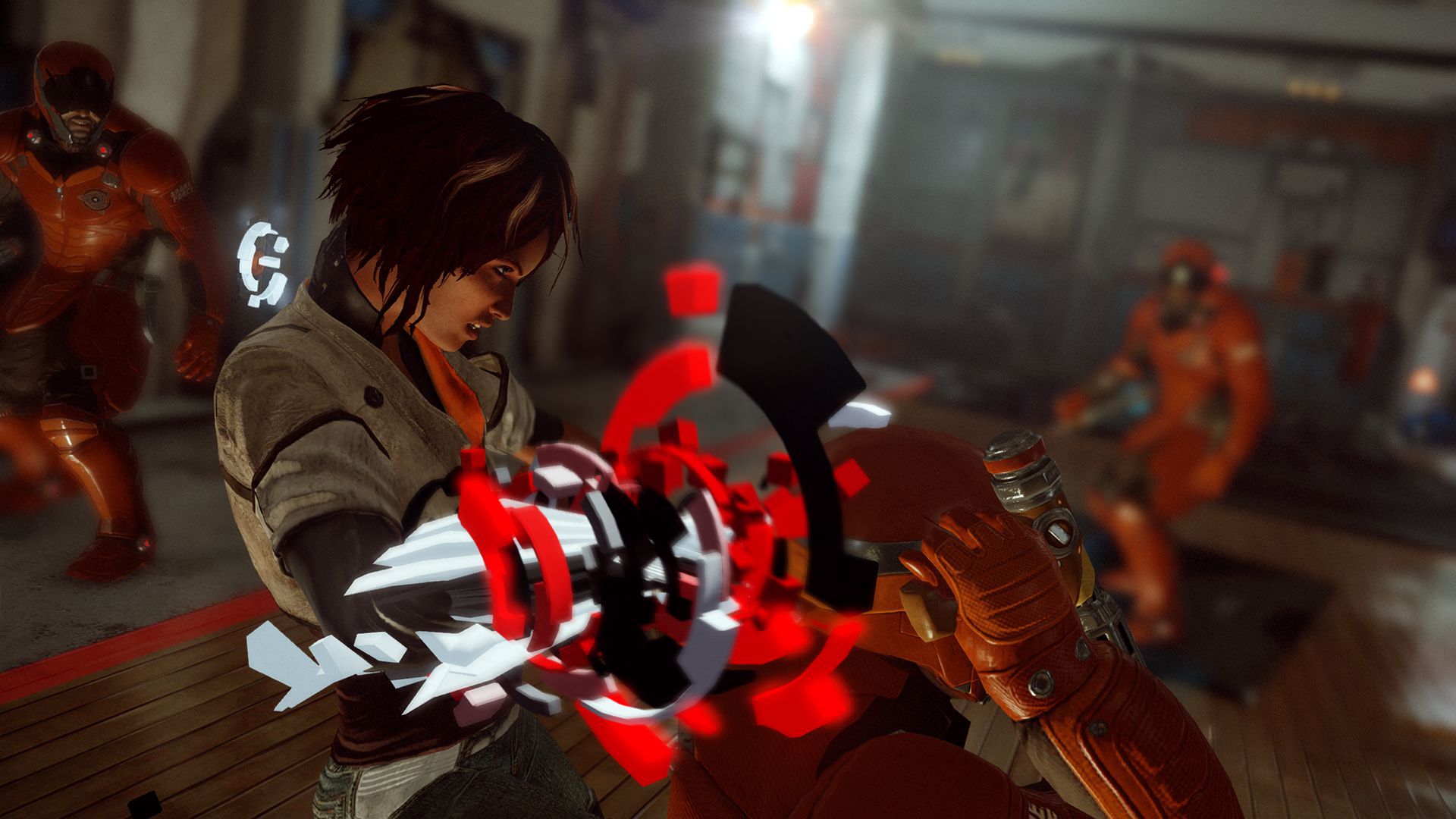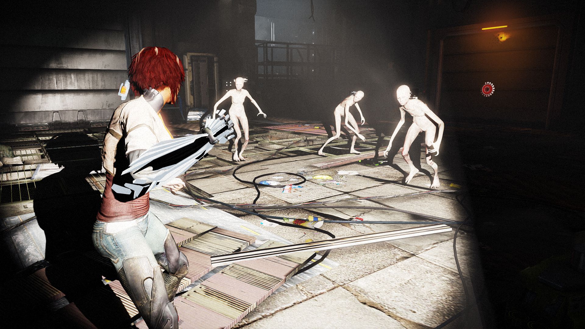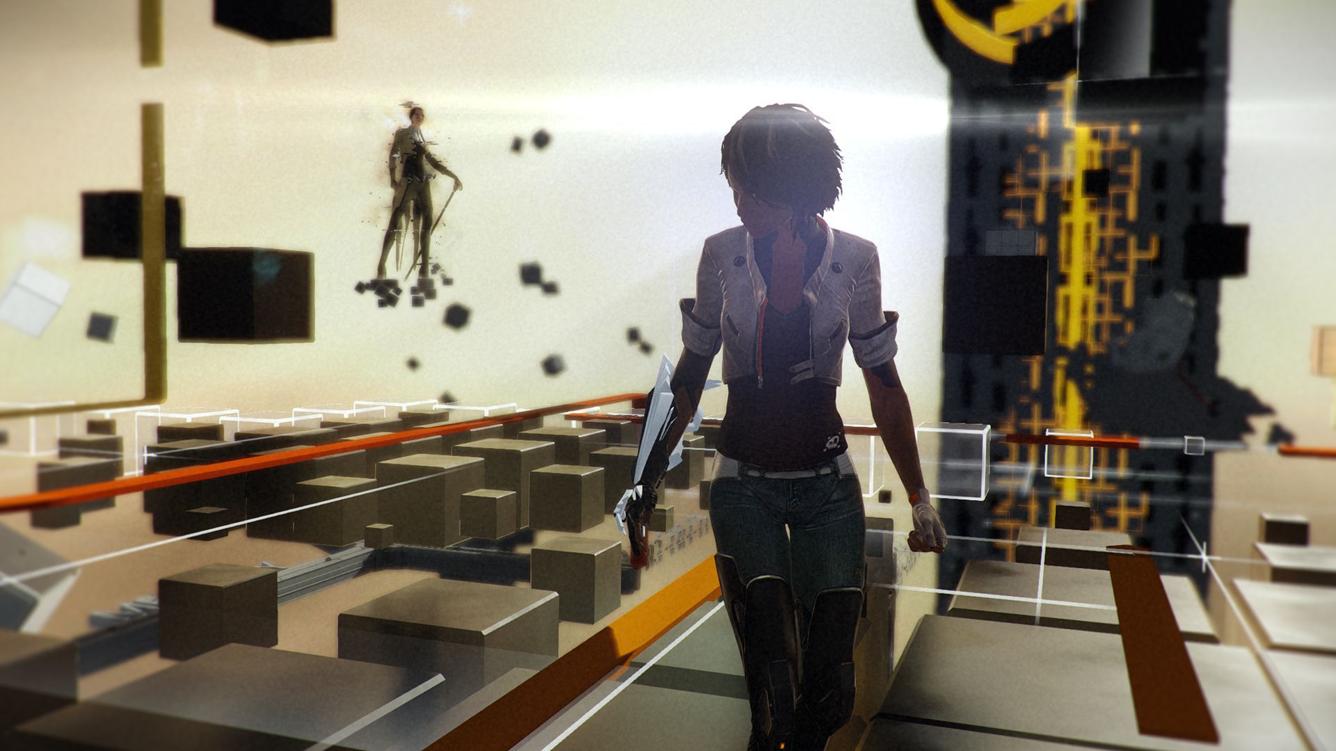Hay varias secuencias en la que es necesario sortear un peligro físico, o esquivar a patrullas de robots. Para ello tenemos que usas los elementos que nos ofrece el entorno, como persianas, puertas, plataformas, etcétera. Sin pistas, serían también unos puzles brillantes, pero los indicadores nos evitan prácticamente hacer cualquier esfuerzo mental. Todo, absolutamente todo con lo que podemos interactuar está señalado con un gigantesco cartel naranja y blanco, y erradica toda posibilidad de pensar de qué podemos ayudarnos para únicamente dejarnos la opción de averiguar en qué orden hacerlo.