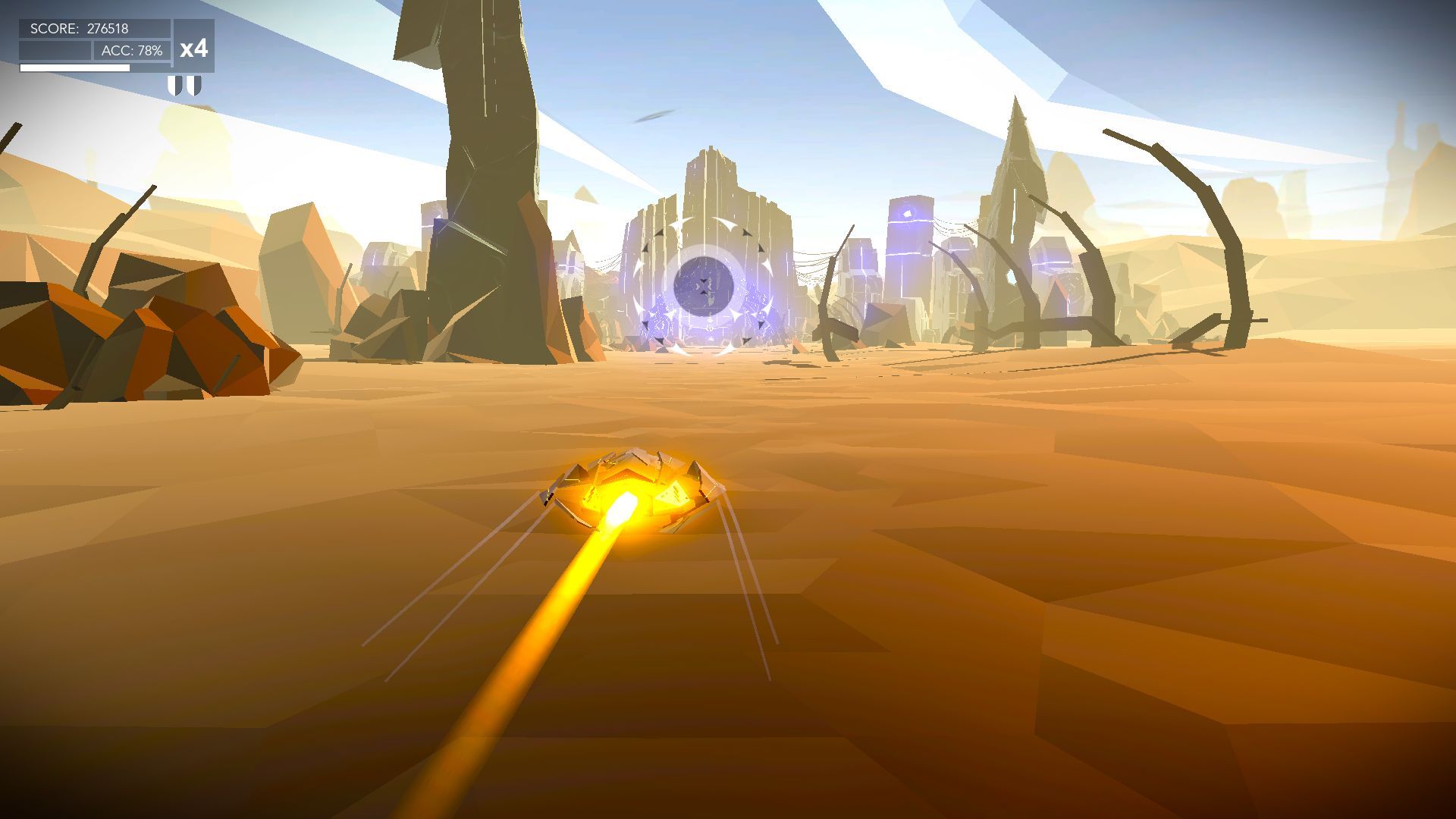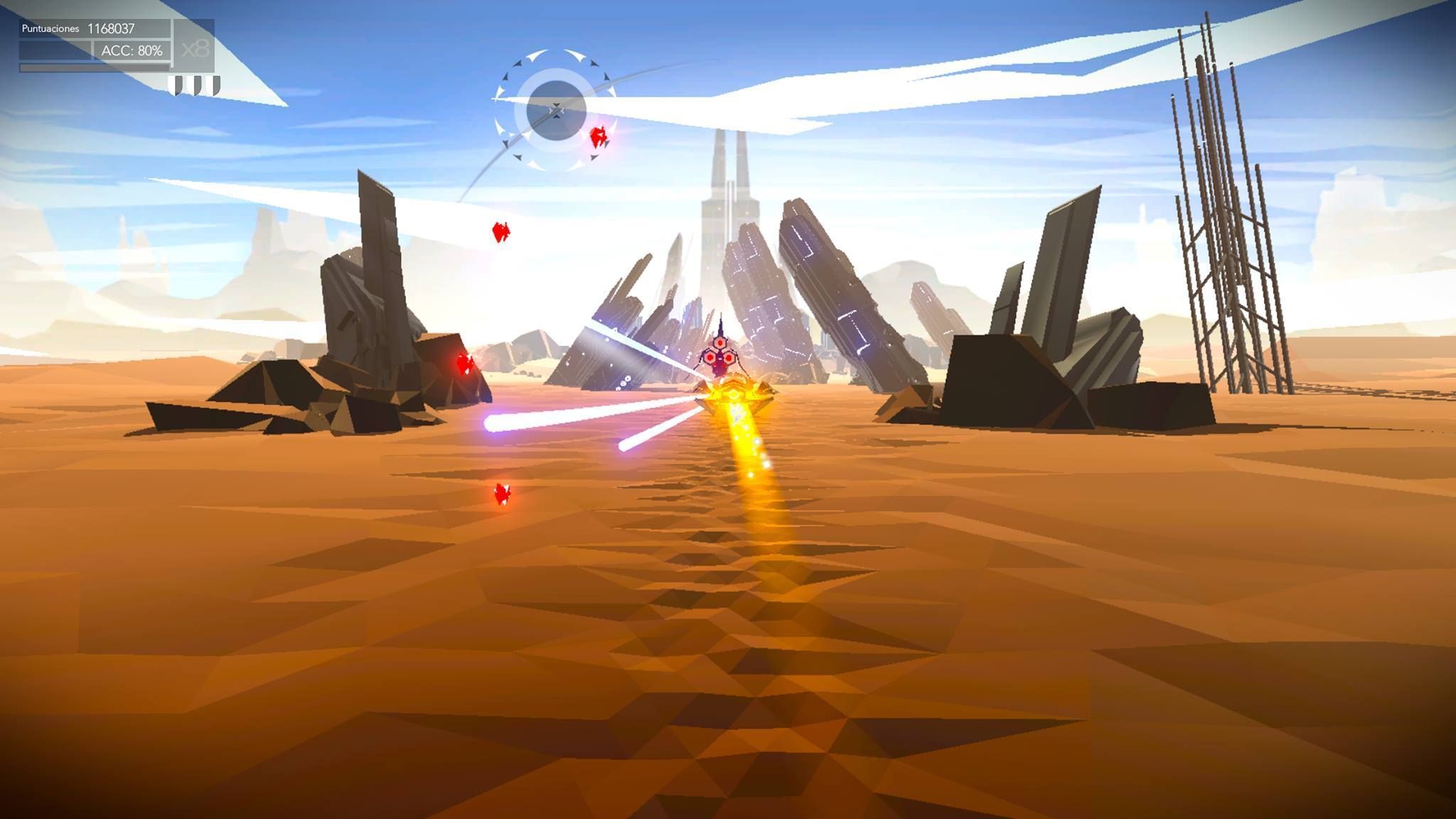El otro aspecto de su jugabilidad es la acción, aunque Aaero no es un shooter arcade al uso. Con la palanca derecha pasamos el cursor sobre los enemigos que aparecen por el escenario o sus proyectiles; hasta una cantidad límite quedan marcados, y entonces podemos disparar unos rayos que eliminan estas amenazas. El equipo dice inspirarse en múltiples títulos como Panzer Dragoon o el mencionado REZ para este apartado. Dispone de algunos bonus por combos y disparar en el momento preciso del ritmo.