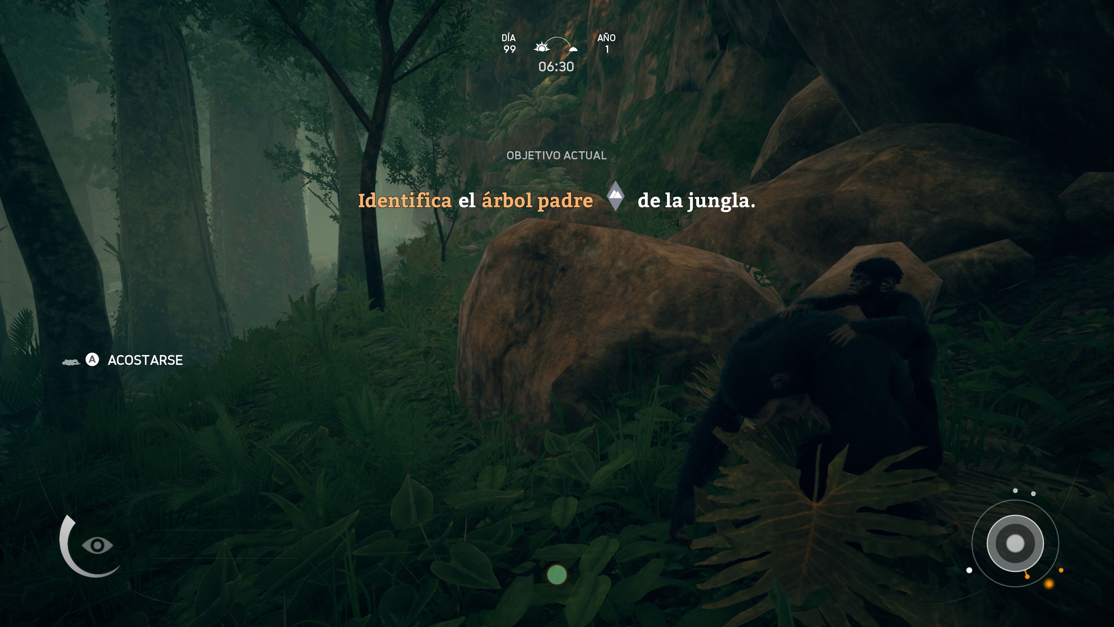 Por eso nos parece contradictoria la excesiva tutoría a la que se somete al jugador en la versión de consolas. Durante las primeras horas de juego no dejan de aparecer carteles que explican desde el funcionamiento de los indicadores de energía, resistencia y vitalidad hasta la interacción con otros simios. Al entrar por primera vez en el menú de evolución se detalla su uso con pelos y señales. Además, se ha introducido un sistema de misiones que te va guiando por la experiencia la primera vez que juegas, dándote órdenes que siempre puedes recordar pulsando la cruceta: que si construir un lecho, que si ahuyentar a un animal, que si conseguir una pareja y parir… Es evidente que muchos jugadores recibirán con los brazos abiertos el ritmo impuesto de aprendizaje, pero es innegable que esa satisfacción de aprender por uno mismo se pierde.