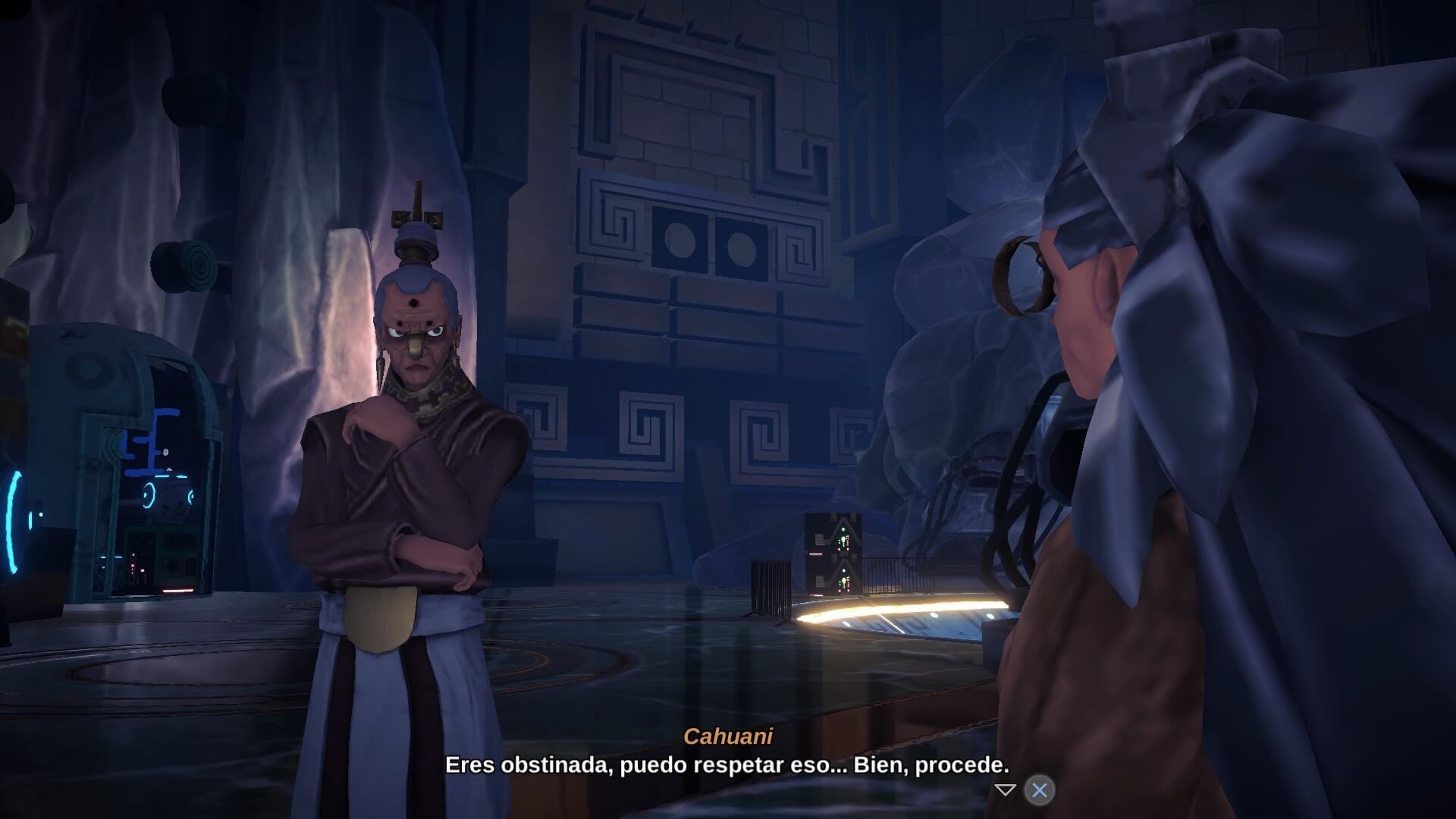 A nivel narrativo el juego no funciona mucho mejor. Creemos que existen buenas ideas en el fondo y el contexto de la cultura azteca siempre ayuda, pero los diálogos son tan pesados que rompen por completo el ritmo de juego y lo vuelven aburrido, que es lo peor que puede ocurrir. La trama gira en torno a los hallazgos arqueológicos del Guardaluz —y la energía que lo alimenta— y cómo el profesor Cahuani quiere truncar la investigación de la madre de Achtli, pero no exageramos si decimos que los momentos en los que un personaje no está hablando son mínimos, y las conversaciones suelen ser muy olvidables. Incluso cuando sabemos cuál es nuestro objetivo y podemos al fin salir a la ciudad con libertad, es el propio guante el que nos habla a través de la personalidad de Tez —seguramente una abreaviación del dios Tezcatlipoca—, la deidad olvidada que nos ayudará a lo largo del juego.