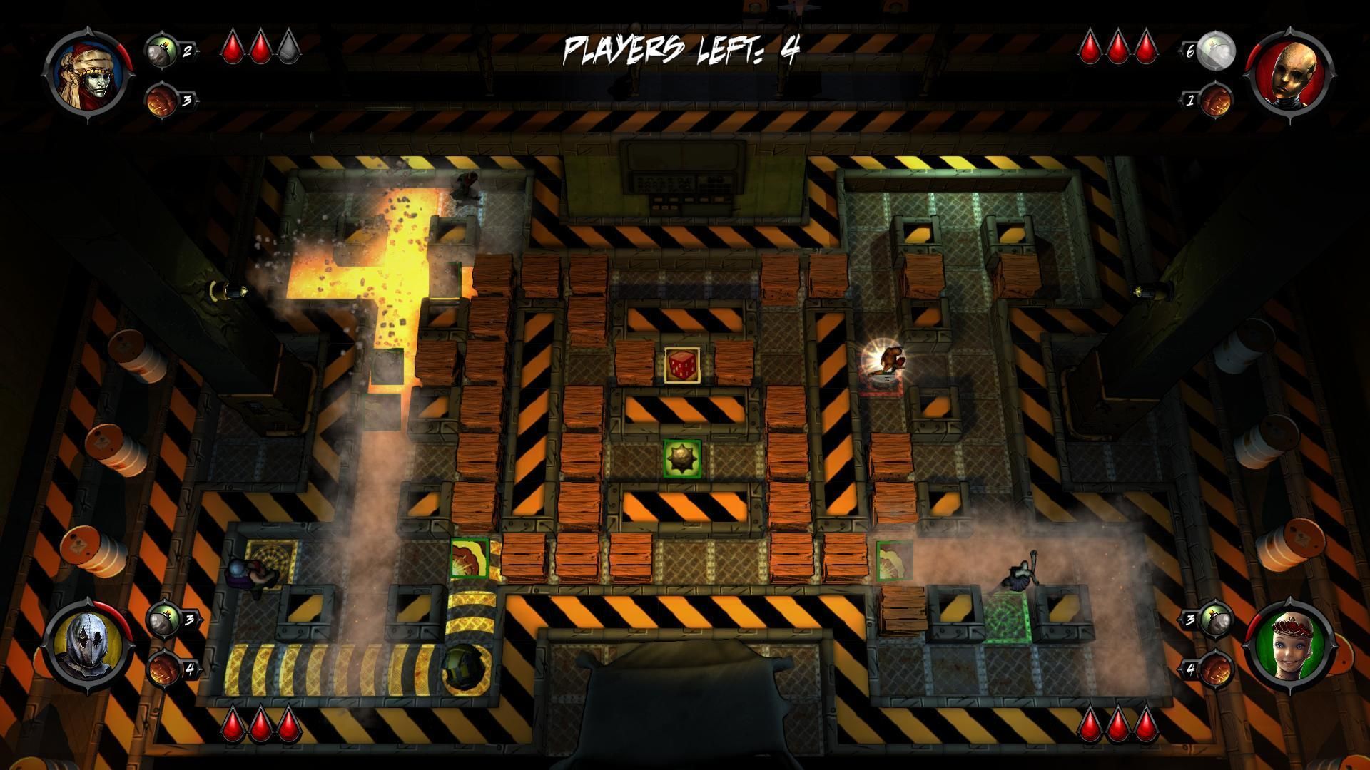 Otro cambio está en el aviso mediante indicaciones del tamaño de las explosiones, y hasta de la casilla donde nos situamos. Saber hasta dónde llegará el fuego enemigo facilita un poco la partida y desaparecen las dudas sobre el alcance de las explosiones. Como todos los jugadores tienen constancia de esto, aquí no desequilibra la dificultad, pero sí es cierto que lo hace menos tenso. Es curioso que se haya optado por algo así y creemos que la razón está ni más ni menos en un fallo de diseño derivado del estilo oscuro, sucio y gore que ya tenía Basement Crawl. No vamos a mentir, no nos apasiona, y además hace que los personajes y bombas no tengan demasiado contraste en los mapas de suelos oscuros. Si has copiado la fórmula de Bomberman, no deberías tener reparos en buscar una dirección artística similar, siempre es mejor eso que mirar de reojo a Bomberman Act Zero.