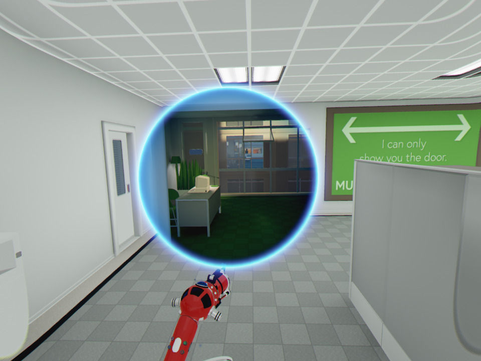 Esta pistola dispara una bolita que, al aterrizar en una superficie lo suficientemente grande, se convierte en un portal de teletransporte. Lo primero que hace es abrir una especie de ventana que nos permite ver qué nos aguarda en la zona a la que nos vamos a teletransportar antes de hacerlo, pudiendo cancelar el viaje. Es una mecánica fantástica, que funciona genial, y que nos anima a explorar cada escenario para encontrar la ruta que nos interesa.