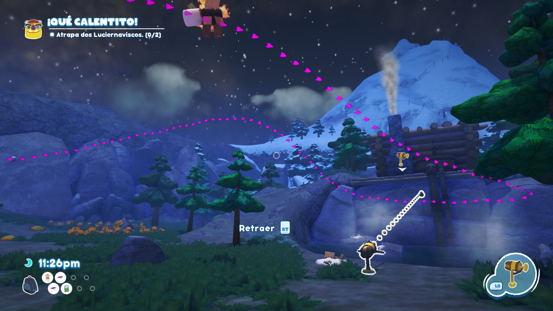 Pero esa estructura se siente desconectada de la mecánica principal (atrapar meriensectos), y probablemente le habría venido mejor a la historia confiar más en el interés del jugador; plantear un progreso más libre (se nos ocurre algo como Outer Wilds) en que los jugadores vayan conociendo a los Meriensectos, los secretos de la Isla Merienlandia y a los personajes de Pueblo Picnic de un modo no lineal, o al menos no tan rígidos, mientras capturan bichos por el propio interés de completar la suerte de Pokédex que hay y no porque haya que capturar dos Luciernaviscos para completar una misión. Aun así, la historia, con un ritmo ni muy rápido ni muy calmado, nos ha atrapado sobre todo por el misterio que rodea a la desaparición de Isaberta.